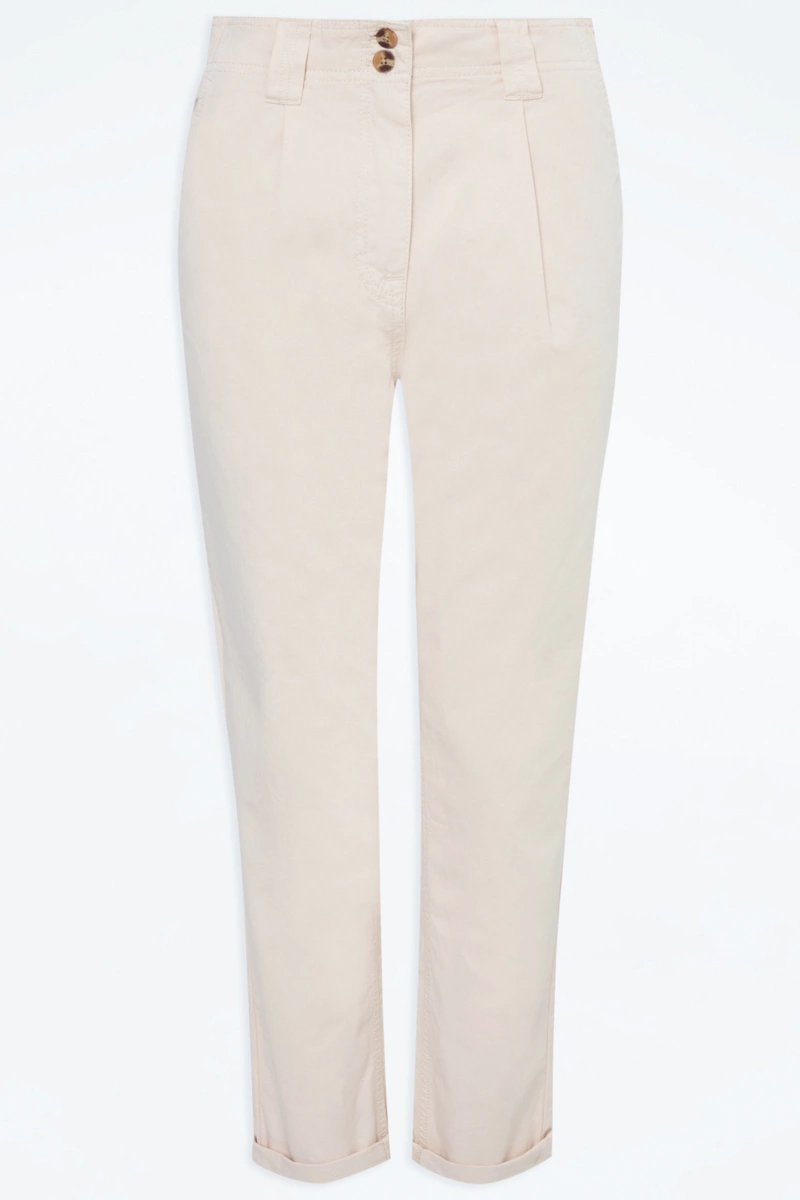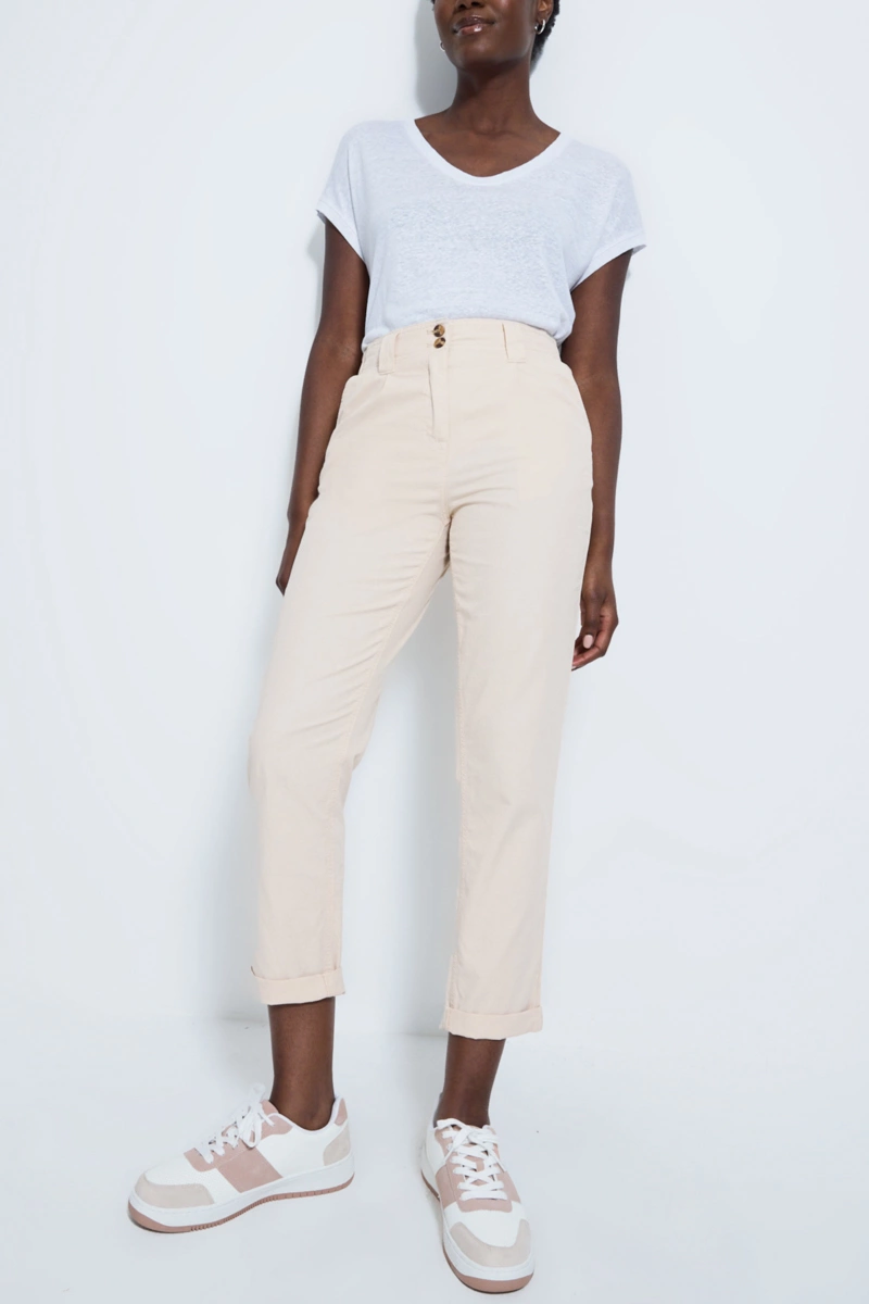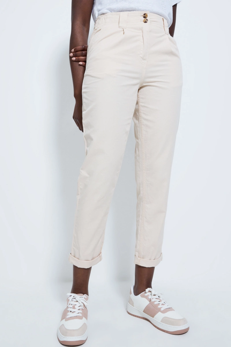 Chinosy firmy Geroge w odcieniu kremowym. Wykonane z lekkiej, bawełnianej tkaniny. Zapinane na zamek i dwa guziki. W pasie szlufki i dodatkowo gumka po bokach, dla lepszego komfortu noszenia. Z przodu dwie głębokie kieszenie. Z tyłu dwie kieszenie. Wysokość stanu - wysoki. Nogawki lekko zwężane, podwinięte na końcach (chinosy) z możliwością odwinięcia (nogawki proste).