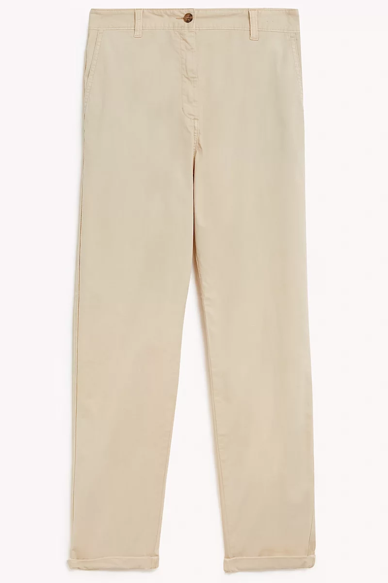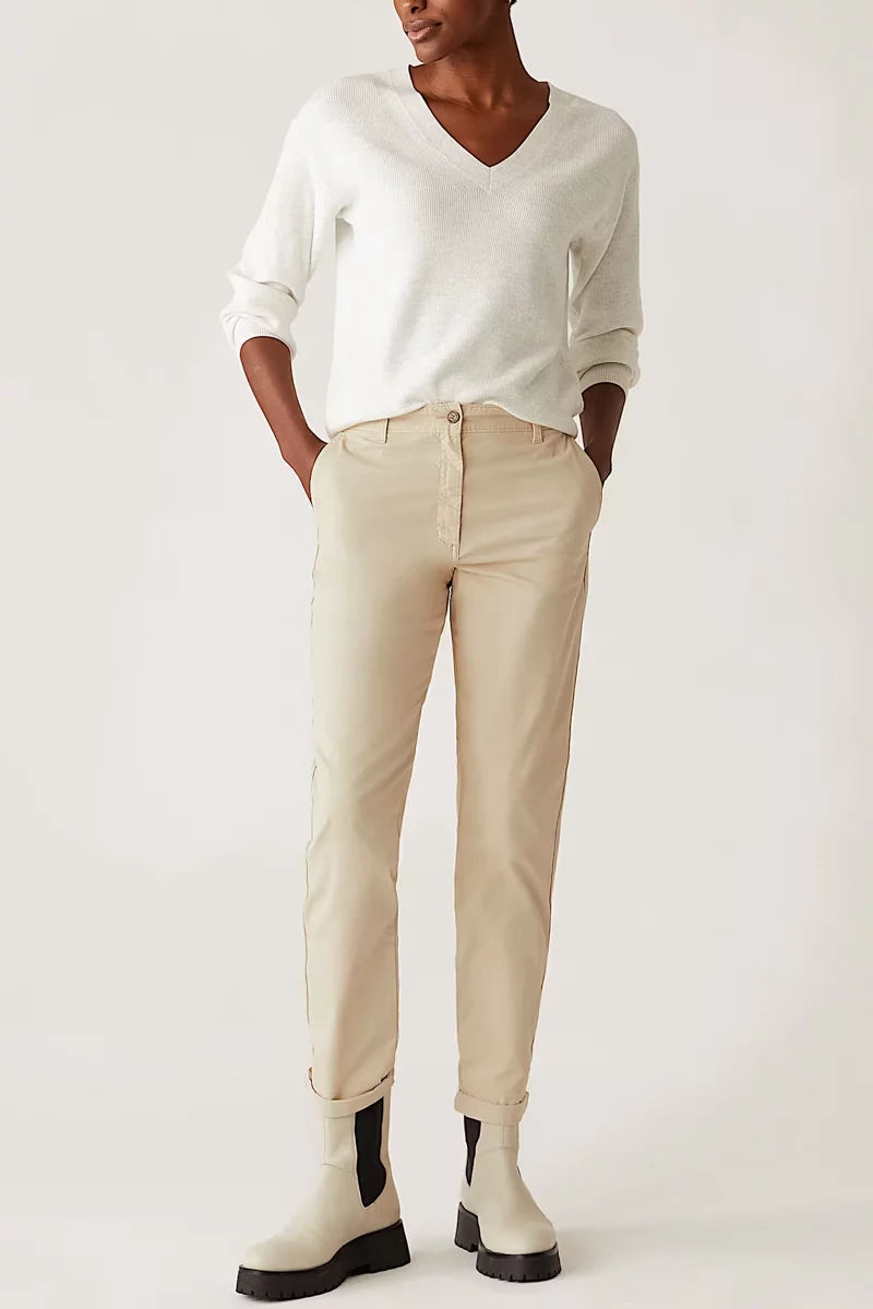 Chinosy firmy Marks&Spencer w odcieniu jasnobeżowym. Długość Regular. Wykonane z lekkiej, bawełnianej tkaniny z dużą zawartością bawełny. Barwione naturalnymi barwnikami. Nowoczesny, dopasowany krój (slim fit), długość do kostek. Nogawki lekko zwężane , podwinięte na końcach (chinosy) z możliwością odwinięcia (nogawki proste). Podkreślający figurę, wysoki stan ze szlufkami na pasek oraz zapięciem na guzik i zamek błyskawiczny. Po bokach wszyta taśma wzmacniająca szwy. Praktyczne dwie kieszenie z przodu. Z tyłu jedna kieszeń zapinana na guzik.