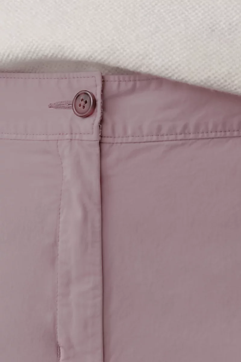 Chinosy firmy Marks&Spencer w odcieniu liliowym. Długość Long. Wykonane z lekkiej, bawełnianej tkaniny z dużą zawartością bawełny. Barwione naturalnymi barwnikami. Nowoczesny, dopasowany krój (slim fit), długość do kostek. Nogawki lekko zwężane , podwinięte na końcach (chinosy) z możliwością odwinięcia (nogawki proste). Podkreślający figurę, wysoki stan ze szlufkami na pasek oraz zapięciem na guzik i zamek błyskawiczny. Po bokach wszyta taśma wzmacniająca szwy. Praktyczne dwie kieszenie z przodu. Z tyłu jedna kieszeń zapinana na guzik.