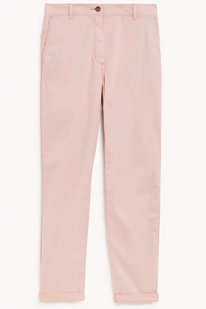 Chinosy firmy Marks&Spencer w odcieniu pudrowego różu. Długość Long. Wykonane z lekkiej, bawełnianej tkaniny z dużą zawartością bawełny. Barwione naturalnymi barwnikami. Nowoczesny, dopasowany krój (slim fit), długość do kostek. Nogawki lekko zwężane , podwinięte na końcach (chinosy) z możliwością odwinięcia (nogawki proste). Podkreślający figurę, wysoki stan ze szlufkami na pasek oraz zapięciem na guzik i zamek błyskawiczny. Po bokach wszyta taśma wzmacniająca szwy. Praktyczne dwie kieszenie z przodu. Z tyłu jedna kieszeń zapinana na guzik.