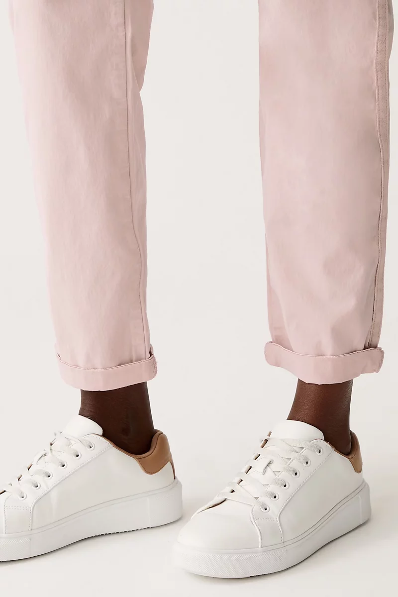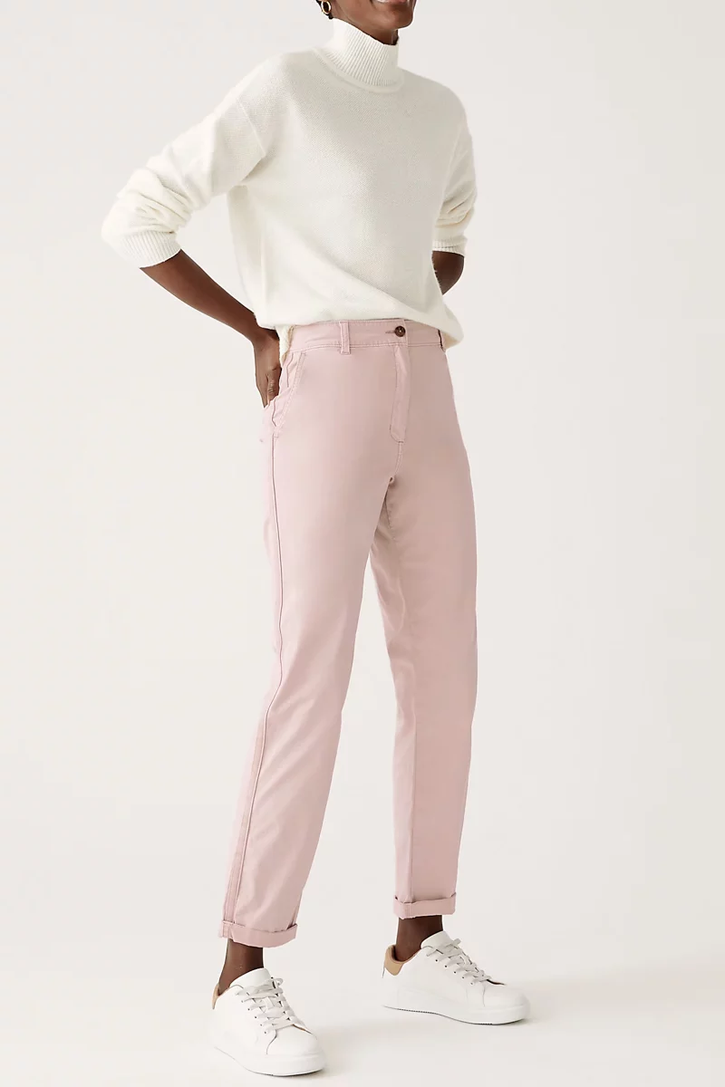 Chinosy firmy Marks&Spencer w odcieniu pudrowego różu. Długość Short. Wykonane z lekkiej, bawełnianej tkaniny z dużą zawartością bawełny. Barwione naturalnymi barwnikami. Nowoczesny, dopasowany krój (slim fit), długość do kostek. Nogawki lekko zwężane , podwinięte na końcach (chinosy) z możliwością odwinięcia (nogawki proste). Podkreślający figurę, wysoki stan ze szlufkami na pasek oraz zapięciem na guzik i zamek błyskawiczny. Po bokach wszyta taśma wzmacniająca szwy. Praktyczne dwie kieszenie z przodu. Z tyłu jedna kieszeń zapinana na guzik.