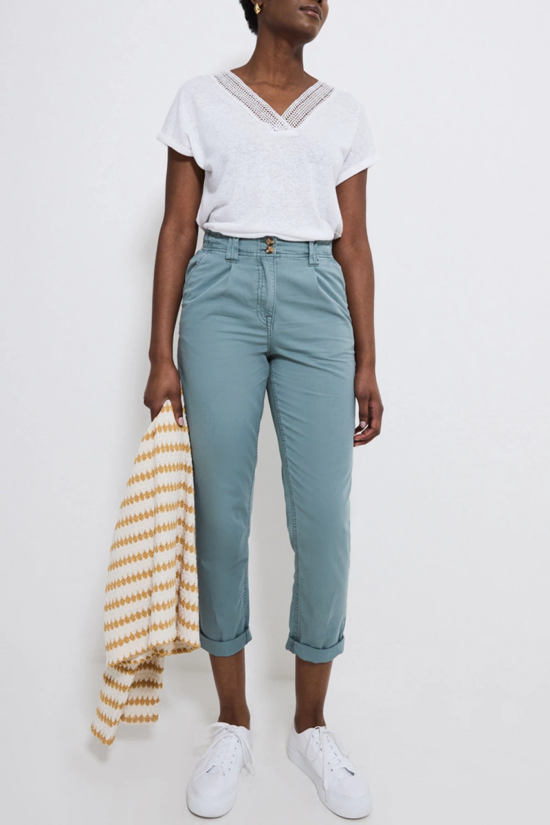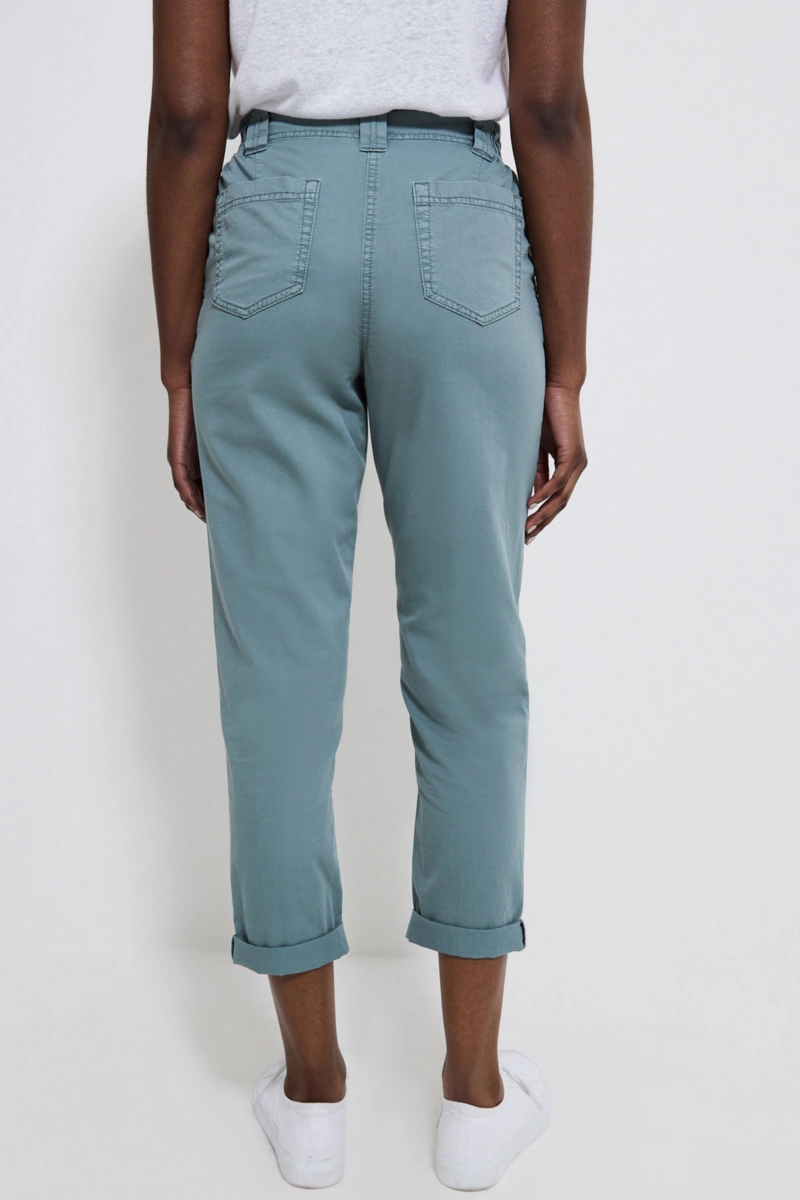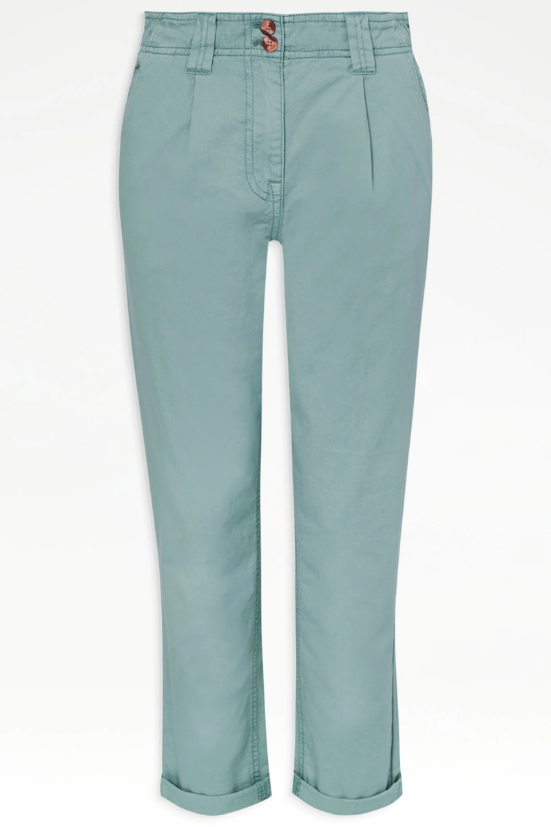 Chinosy firmy Geroge w odcieniu szaroniebieskim. Wykonane z lekkiej, bawełnianej tkaniny. Zapinane na zamek i dwa guziki. W pasie szlufki i dodatkowo gumka po bokach, dla lepszego komfortu noszenia. Z przodu dwie głębokie kieszenie. Z tyłu dwie kieszenie. Wysokość stanu - wysoki. Nogawki lekko zwężane, podwinięte na końcach (chinosy) z możliwością odwinięcia (nogawki proste).