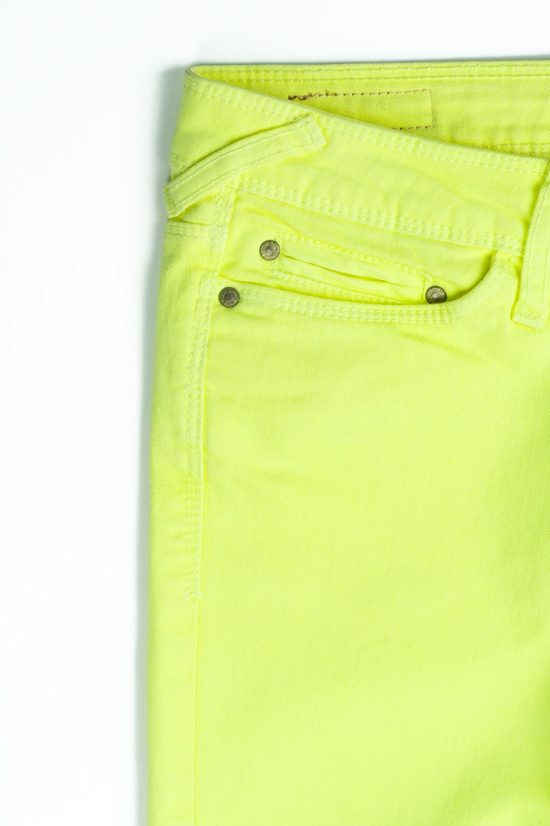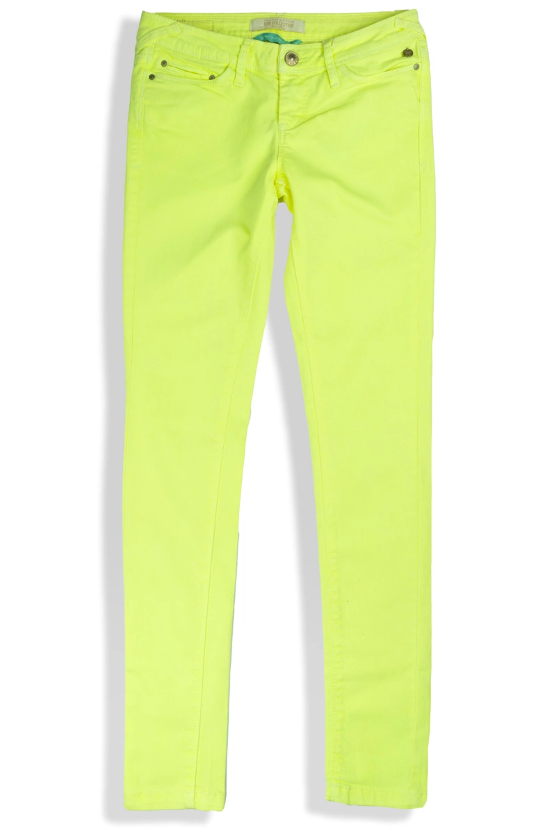 Jeansy marki Bershka w odcieniu żółtym. Model Super Skinny (na szczupłą nogę). Zapinane na guzik i zamek. Wysokość stanu - niska. Dwie kieszenie z przodu i jedna mała z lamówką oraz dwie kieszenie z tyłu. W pasie szlufki.