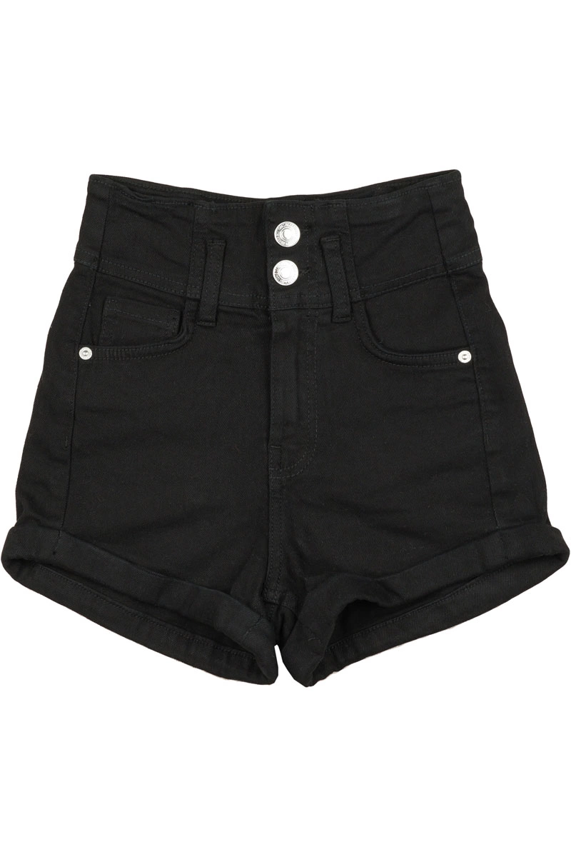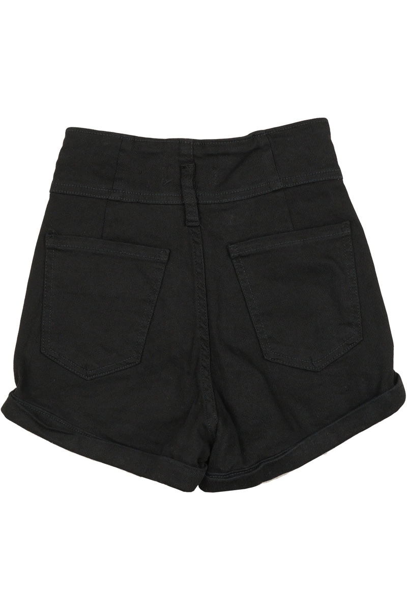 Krótkie jeansowe spodenki firmy Bershka w kolorze czarnym. Zapinane na dwa guziki i zamek. W pasie szlufki. Z przodu posiada dwie głębokie kieszenie, jedną małą kieszeń oraz dwie kieszenie z tyłu. Nogawki podwinięte. Szorty o wysokim stanie.