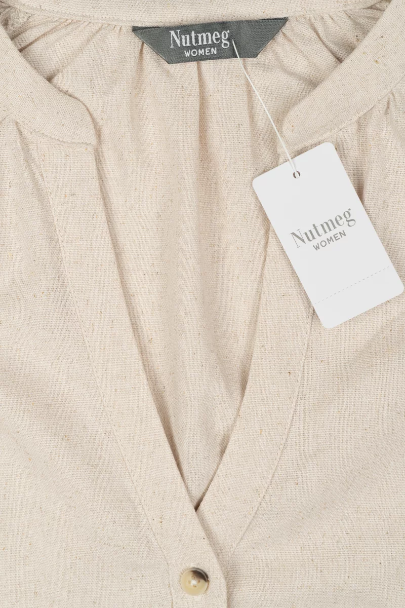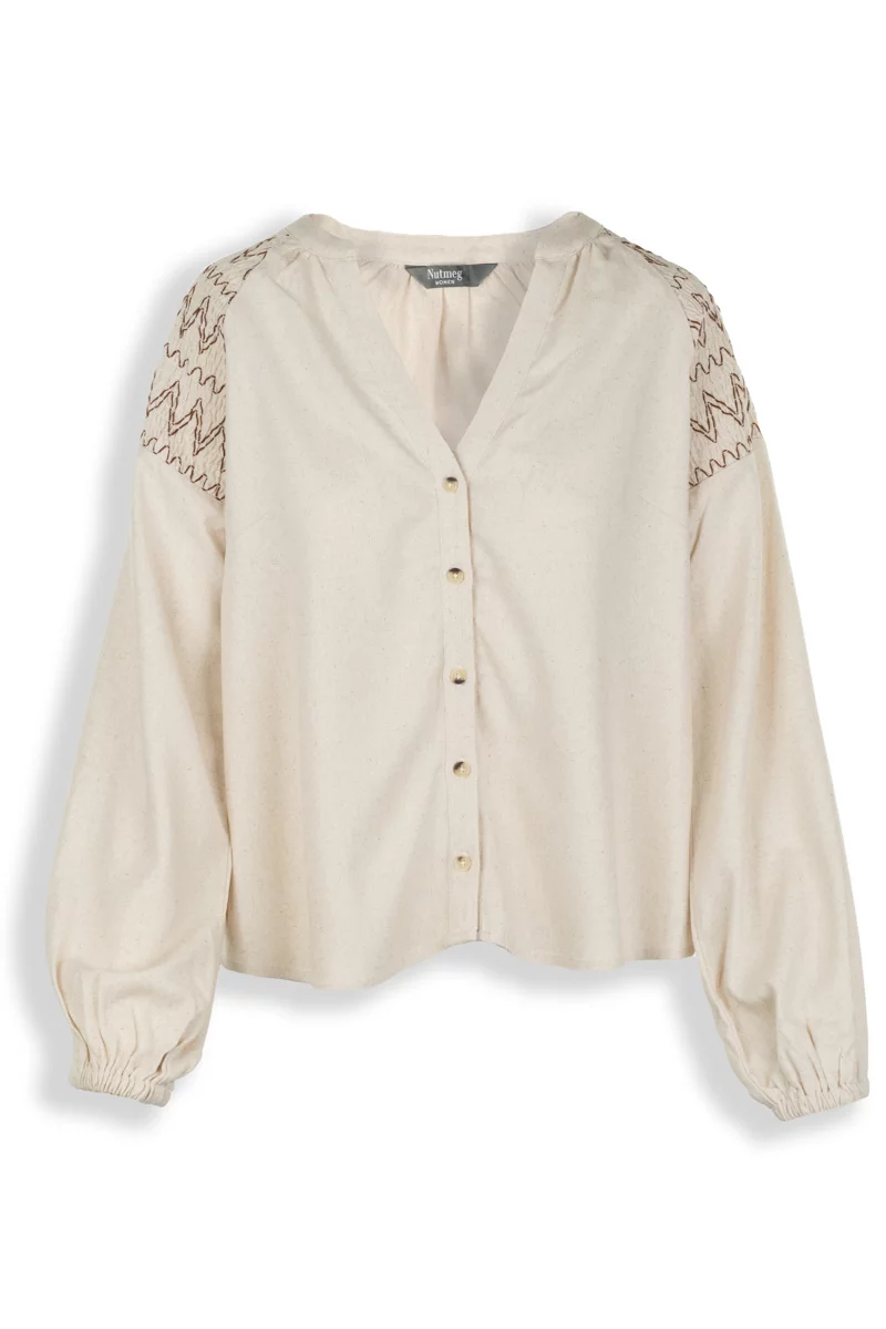 Koszula firmy Nutmeg w odcieniu beżowym. Wykonana z wiskozy, lnu, lyocellu i bawełny. Dekolt w szpic. Zapinana z przodu na kremowo-brązowe guziki. Haftowane ramiona. Na długie, balonowe rękawy, zakończone niewielkim ściągaczem.