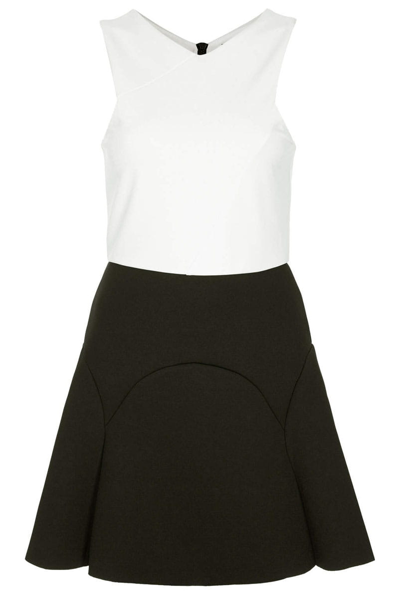 Sukienka firmy Top Shop, w kolorze biało-czarnym. Z tyłu zapinana na czarny zamek. Odcinana w pasie. Dół sukienki wykonany z neopronu (pianki), dzięki czemu sukienka dobrze się układa, nie opada i jest miła w dotyku. Góra uszyta jest na białej podszewce. Z kompletem firmowych metek.