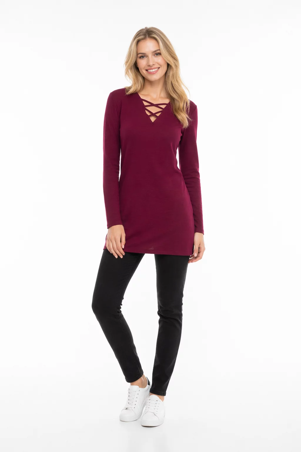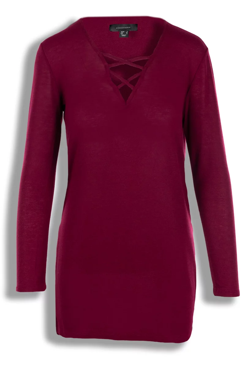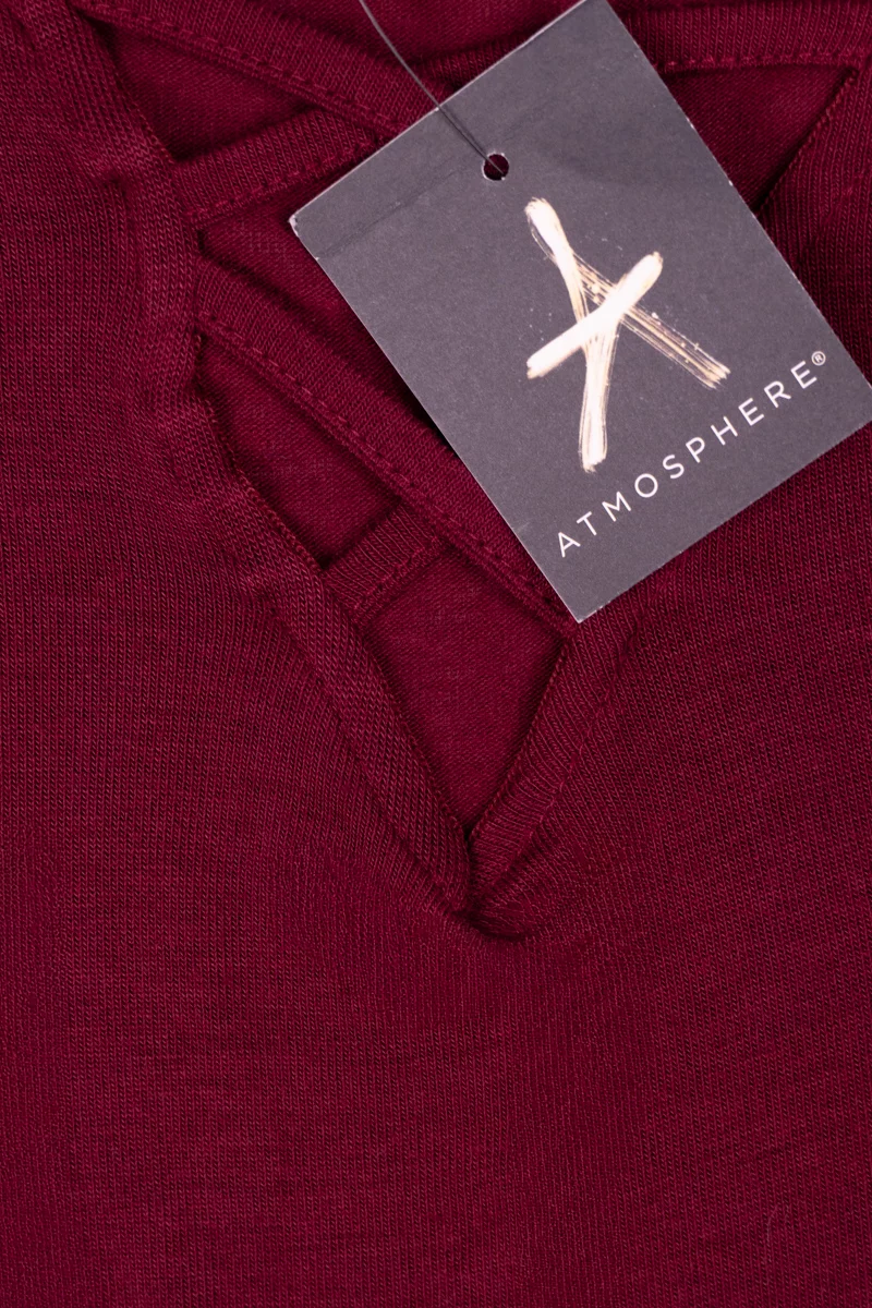 Tunika firmy Atmosphere w odcieniu bordowym. Na długi rękaw. Tunika o przedłużonym kroju, lekko dopasowana do sylwetki. Asymetryczna - o dłuższym tyle. Efektowny dekolt w serek (v-neck) z modnym przeplataniem. Cienkie paseczki tworzą geometryczny wzór, który przyciąga wzrok i dodaje bluzce charakteru. Dekolt w serek oraz pionowe linie przeplatania optycznie wydłużają szyję i wysmuklają górną część sylwetki. Gładka, jednolita dzianina. Bo bokach tunika posiada rozcięcia, dla lepszego komfortu noszenia. Dłuższy fason zakrywający biodra. Materiał lekki, miły w dotyku i elastyczny.