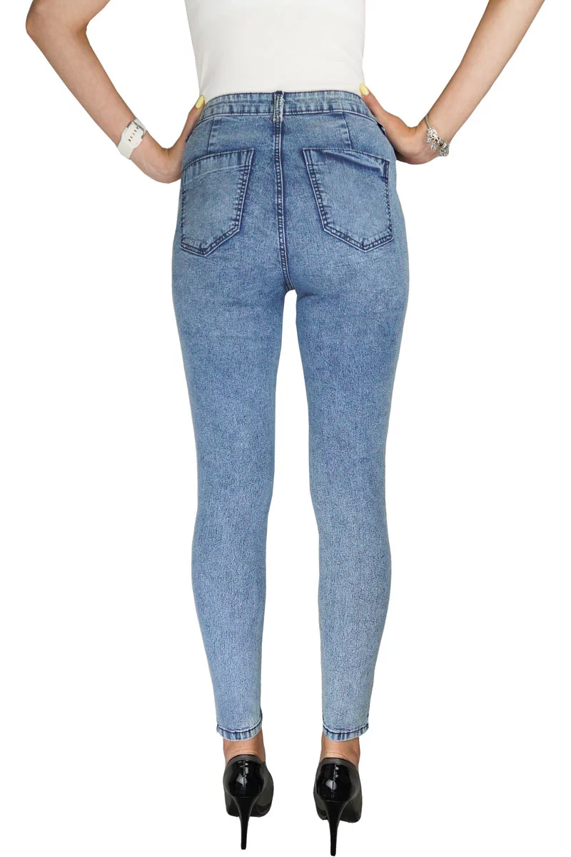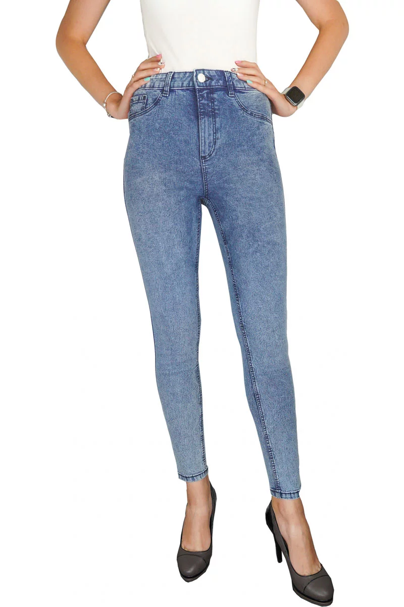Jeansy marki C&A w odcieniu niebiesko-białym (melanż). Model Jeggings. Długość short. Rurki. Zapinane na zamek i guzik. W pasie wszyte szlufki. Z przodu imitacje kieszenie i jedna mała kieszeń. Z tyłu dwie kieszenie.
