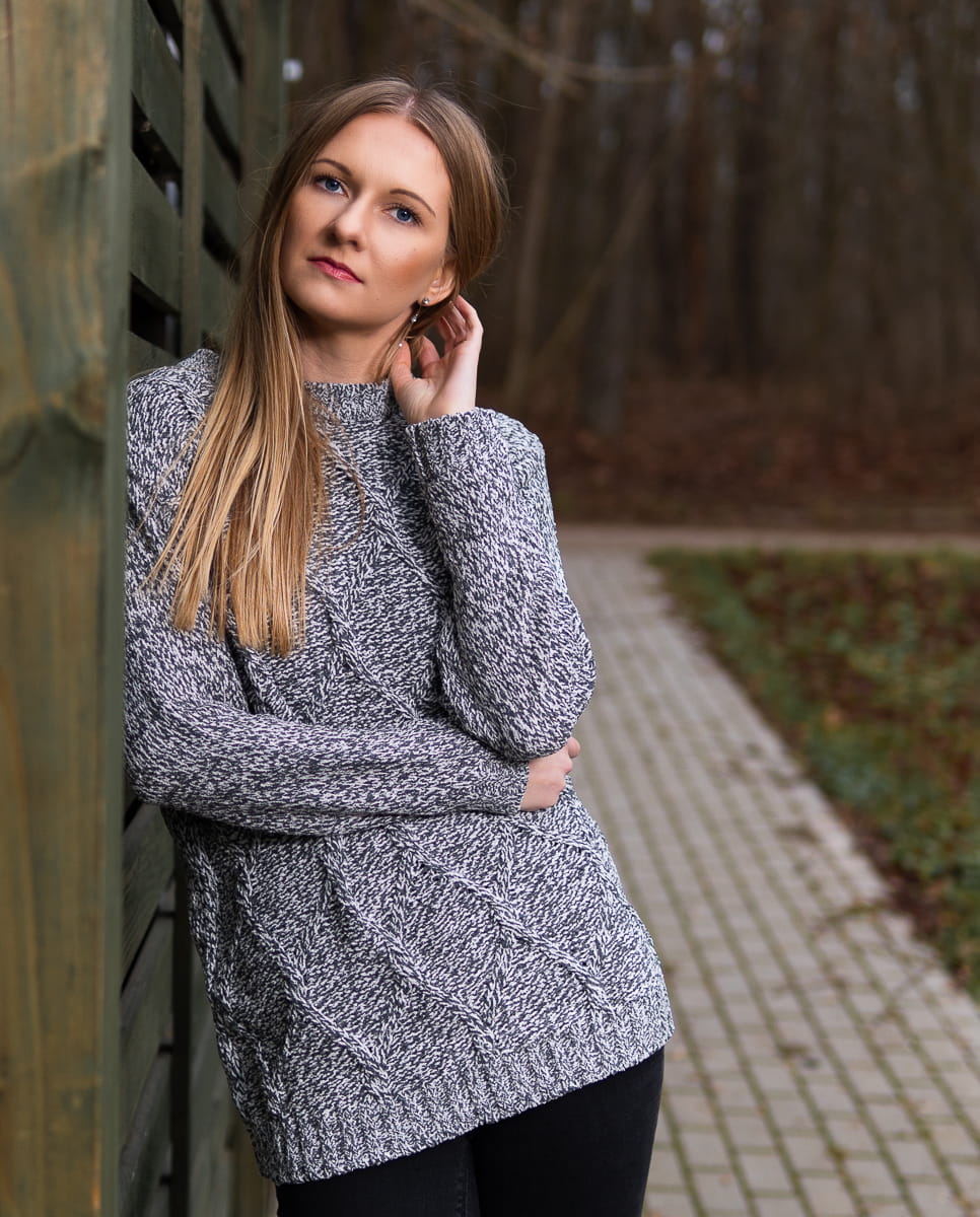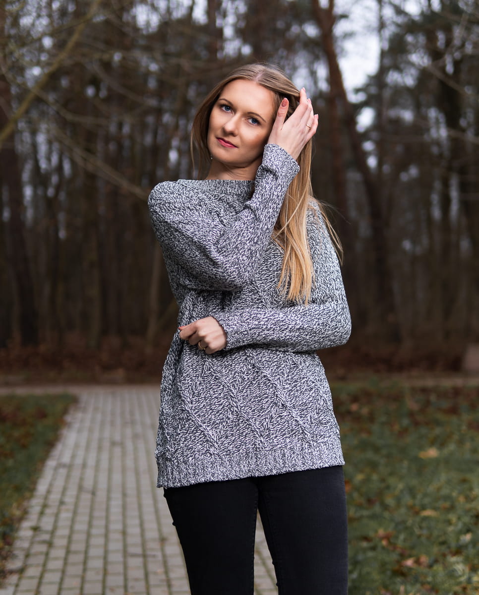 Sweter firmy C&A. Melanżowy w odcieniu grafitowo-białym. Na długi rękaw, zakończony ściągaczem. Dekolt okrągły. Z przodu modny splot. Dół swetra zakończony ściągaczem. Materiał szenilowy. Model oversize (luźny).