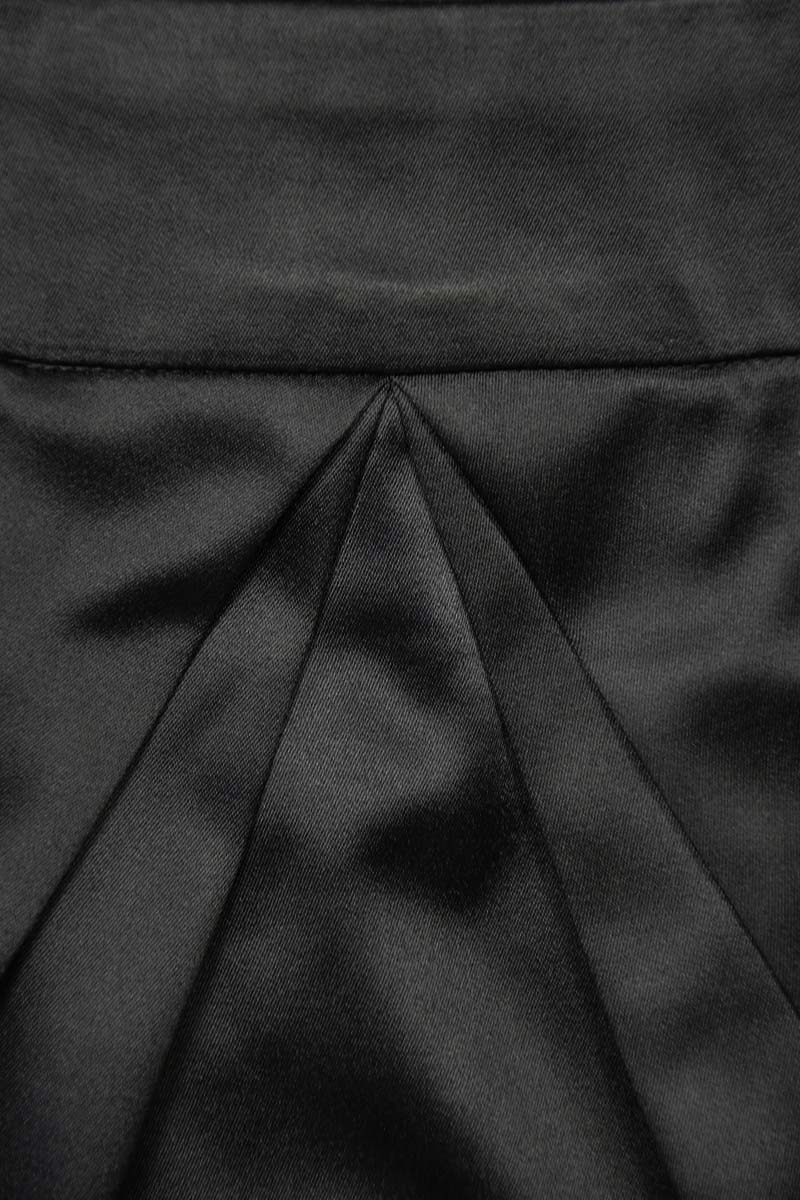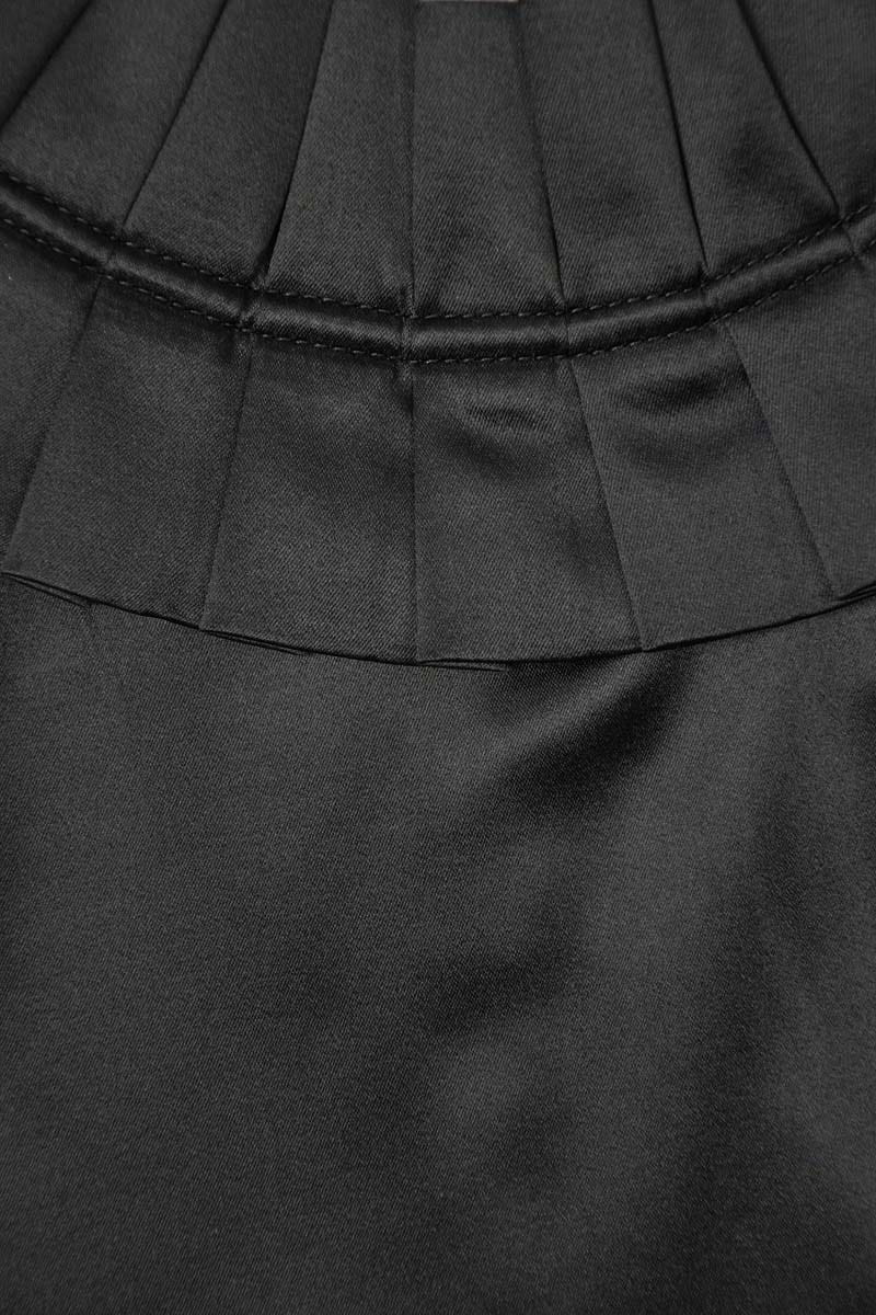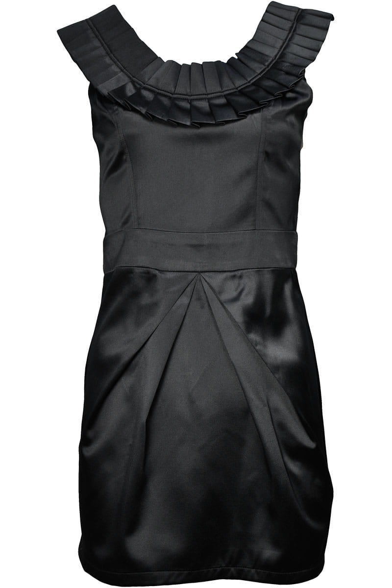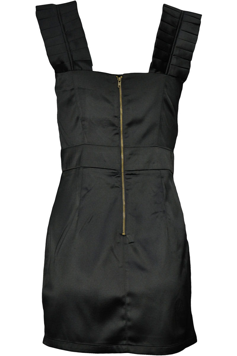 Sukienka wieczorowa w kolorze czarnym. Ramiączka sukienki oraz dekolt zdobiony modnymi zakładkami. Lekko odcinana pod pasem, styl - tuba. Z tyłu zamek koloru złotego. Sukienka na grubych ramiączkach, elegancka.