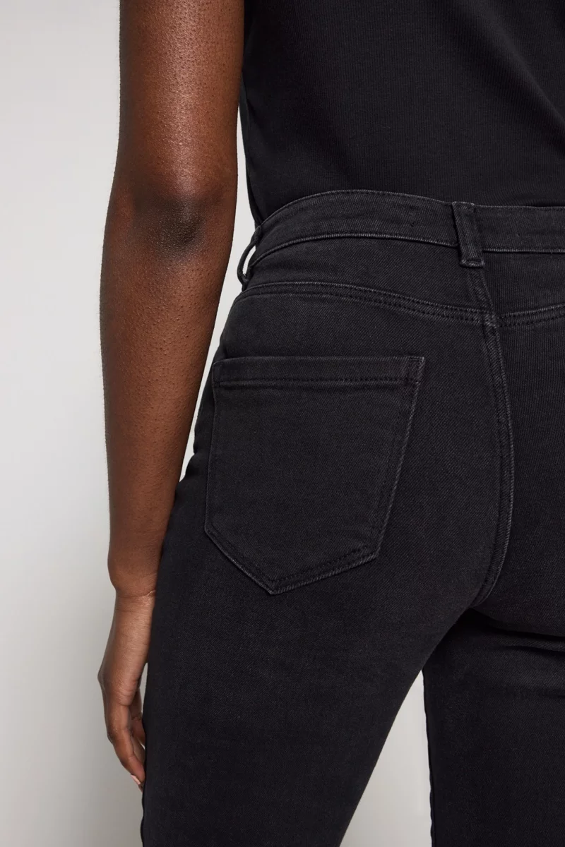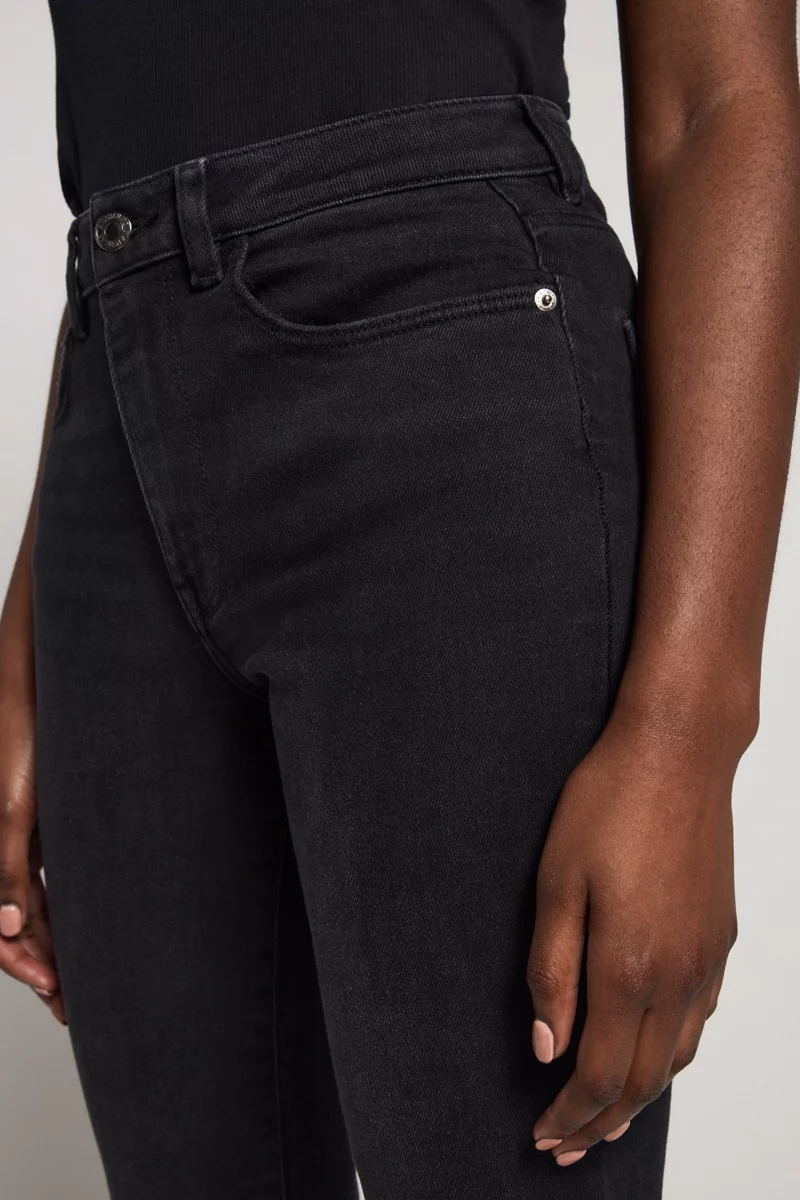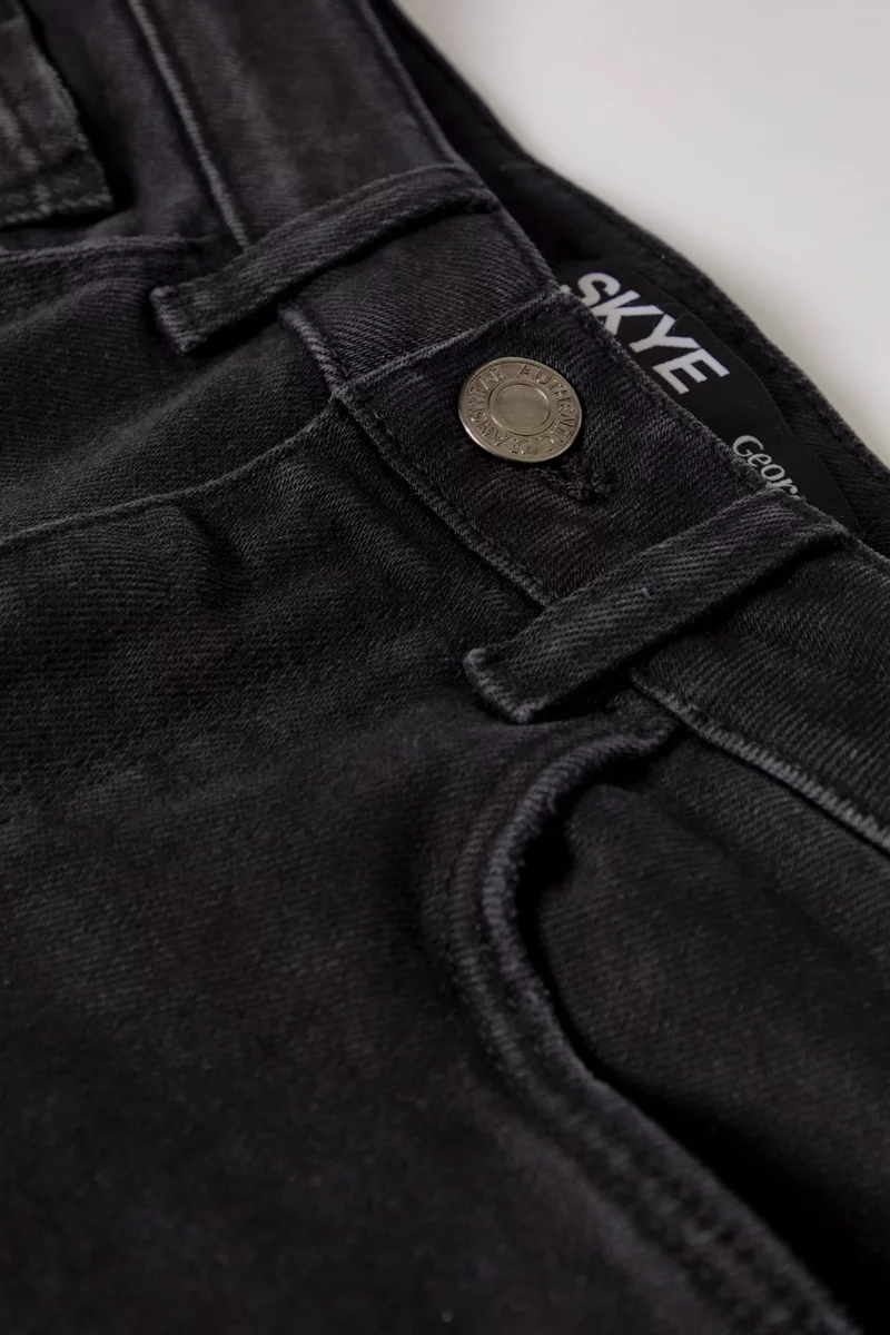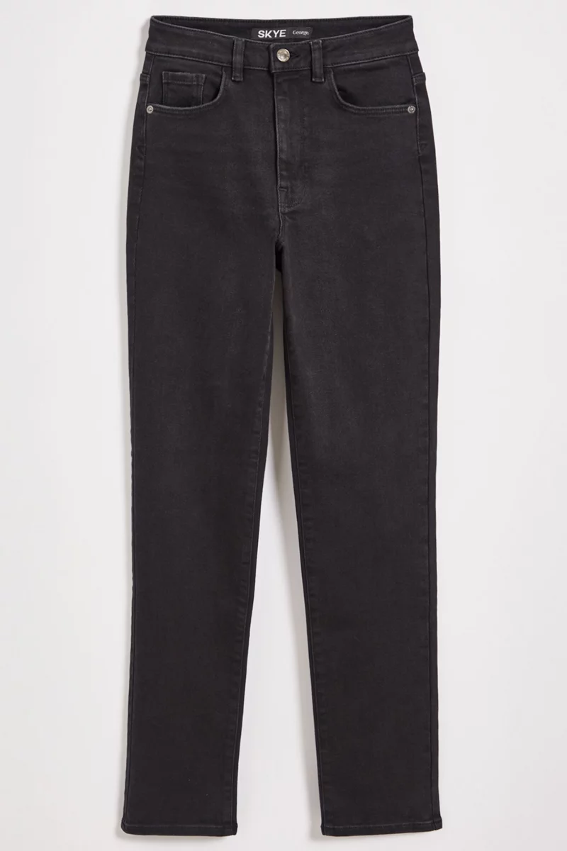 Jeansy firmy George w kolorze czarnym. Model Skye, Straight. Zapinane na zamek i guzik. Nogawki proste. Z przodu dwie duże kieszenie i jedna mała kieszeń. Z tyłu dwie kieszenie. W pasie wszyte szlufki. Jeansy o wysokim stanie.