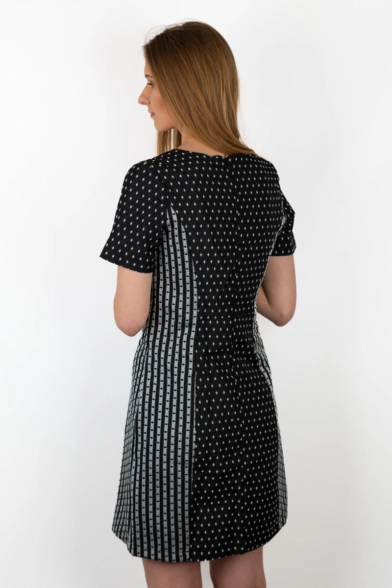 Sukienka firmy Cotton Club. W kolorze czarnym, po bokach posiada białe wstawki. Materiał wzorzysty. Na krótki rękaw. Odcinana w pasie. Z tyłu zapinana na kryty zamek. Góra sukienki uszyta na czarnej podszewce. Dół lekko poszerzany. Z kompletem firmowych metek.