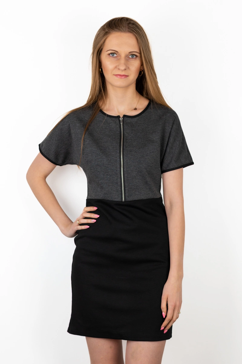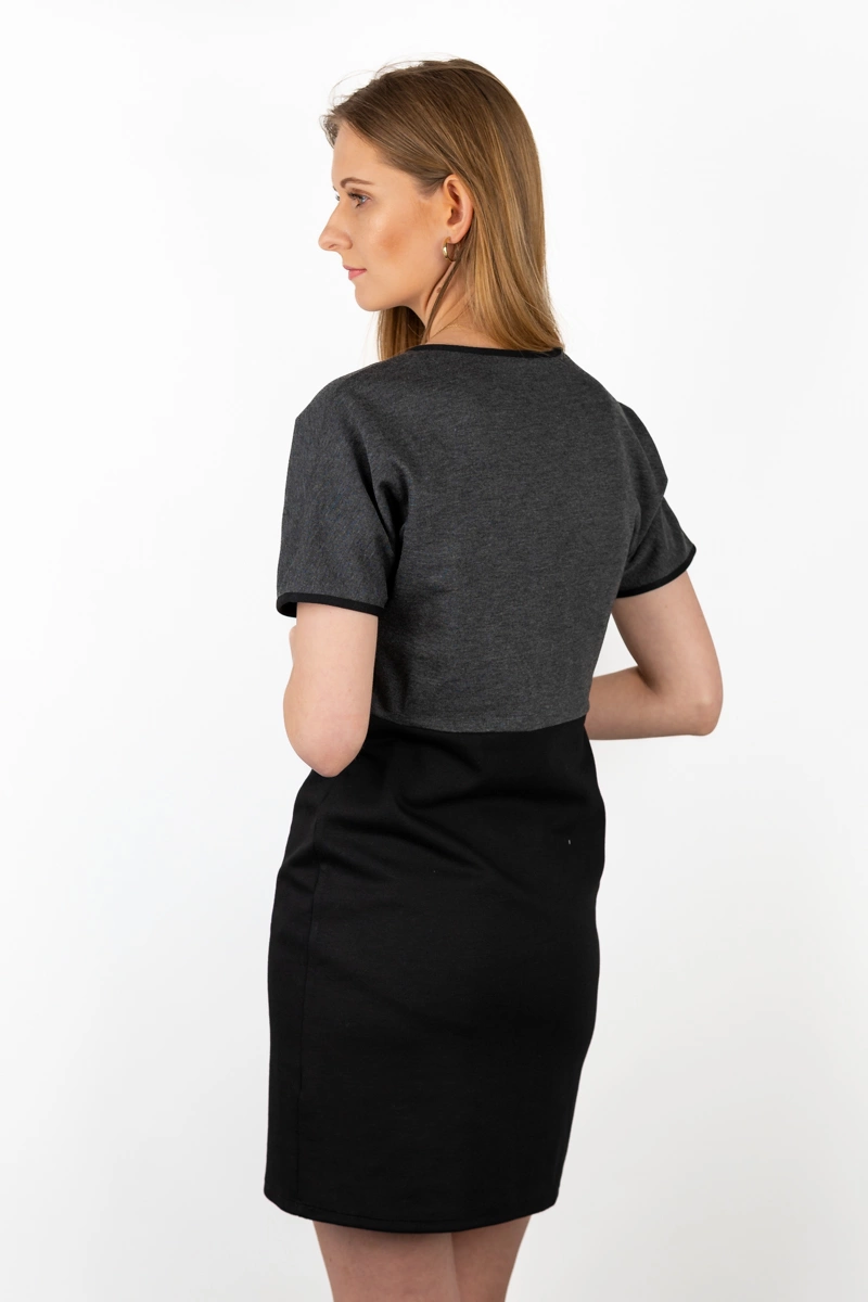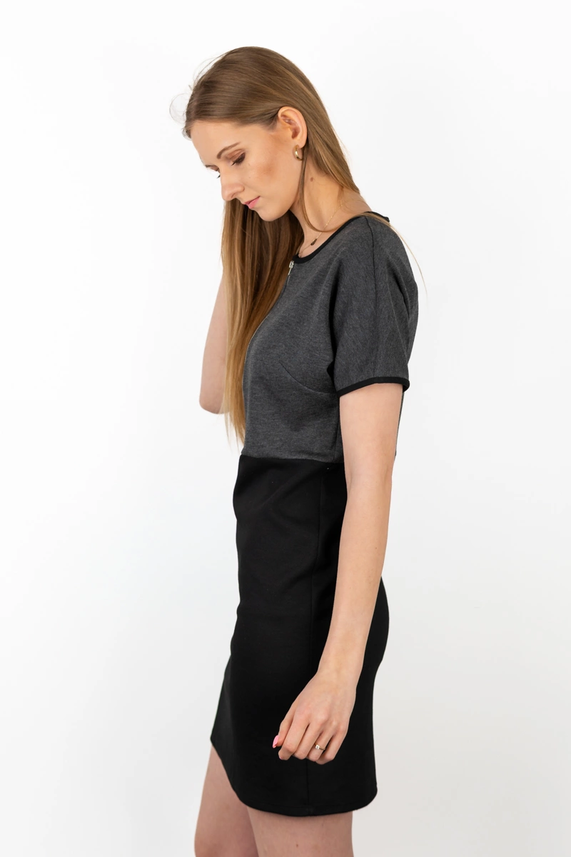 Sukienka firmy BHS. Góra sukienki w odcieniu grafitowym, dół w kolorze czarnym. Z przodu zapinana na zamek. Na krótki rękaw. Odcinana w pasie. Sukienka uszyta z elastycznego materiału, dobrze dopasowuje się do sylwetki. Materiał miły w dotyku i dobry gatunkowo.