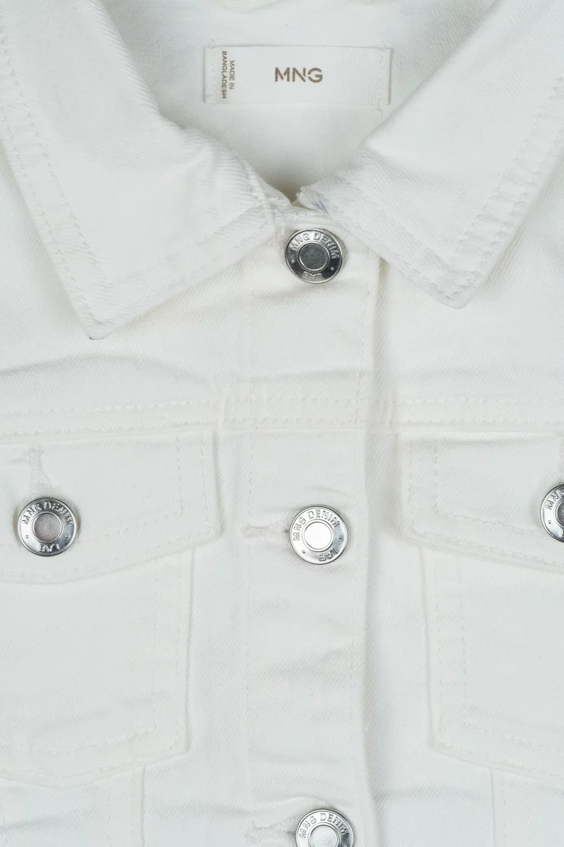 Bawełniana kurtka / katana firmy Mango w kolorze białym. Zapinana na srebrne guziki. Uszyta z jeansowego materiału. Z przodu posiada cztery kieszenie w tym dwie zapinane na guzik. Kurtka z kołnierzykiem. Rękawy długie, na mankiecie zapinane na guzik.