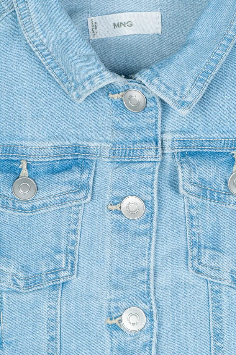 Bawełniana kurtka / katana firmy Mango w odcieniu jasnego jeansu. Zapinana na srebrne guziki. Uszyta z jeansowego materiału. Z przodu posiada cztery kieszenie w tym dwie zapinane na guzik. Kurtka z kołnierzykiem. Rękawy długie, na mankiecie zapinane na guzik.
