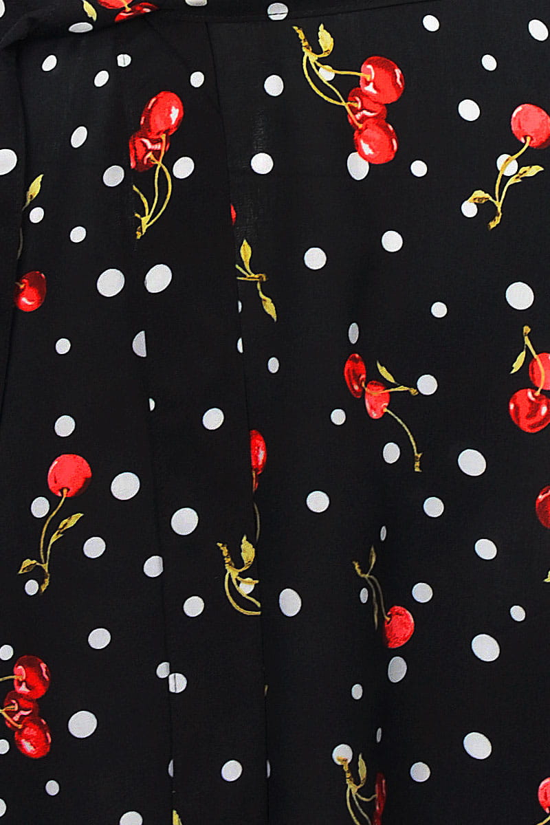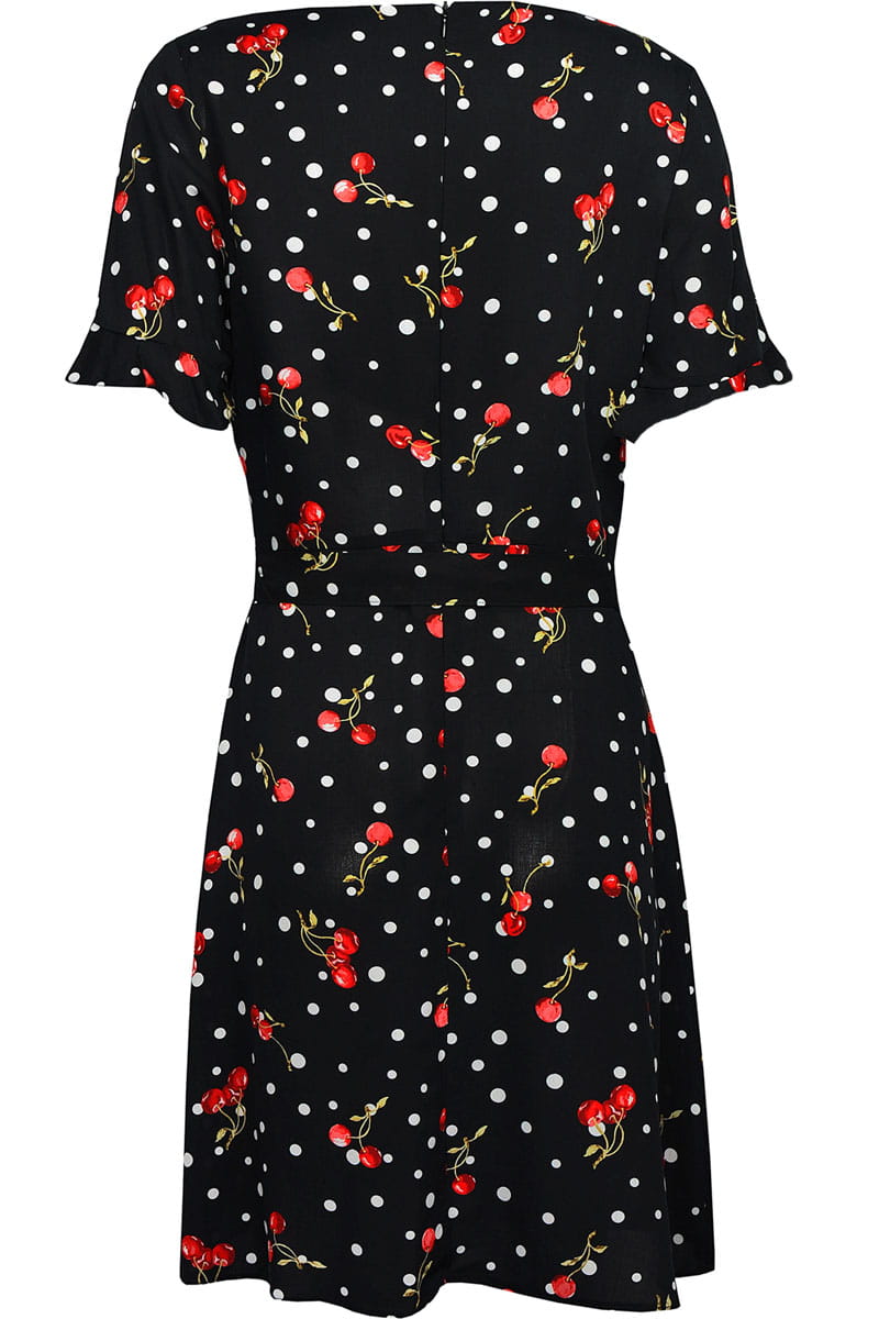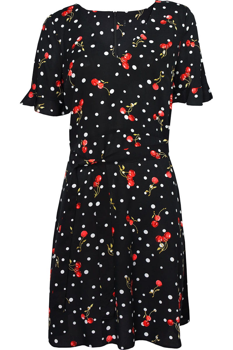 Sukienka marki F&F w kolorze czarnym w wiśnie i białe grochy. Na krótki rękaw, zakończony falbanką. Dekolt w szpic. Długość midi. Sukienka z tyłu zapinana na kryty zamek. W pasie posiada wszyte szlufki oraz wiązany wzorzysty, materiałowy pasek. Dół lekko rozkloszowany. Materiał lekki, przewiewny oraz dobry gatunkowo.