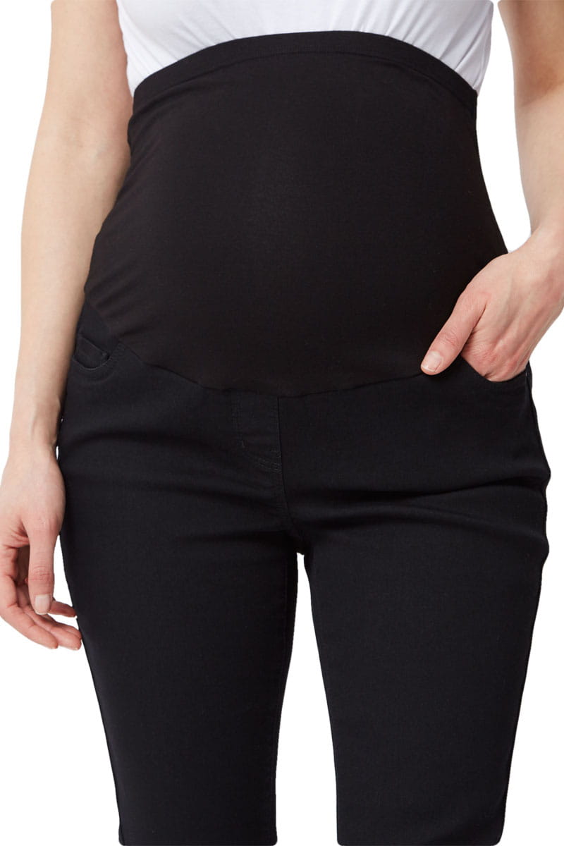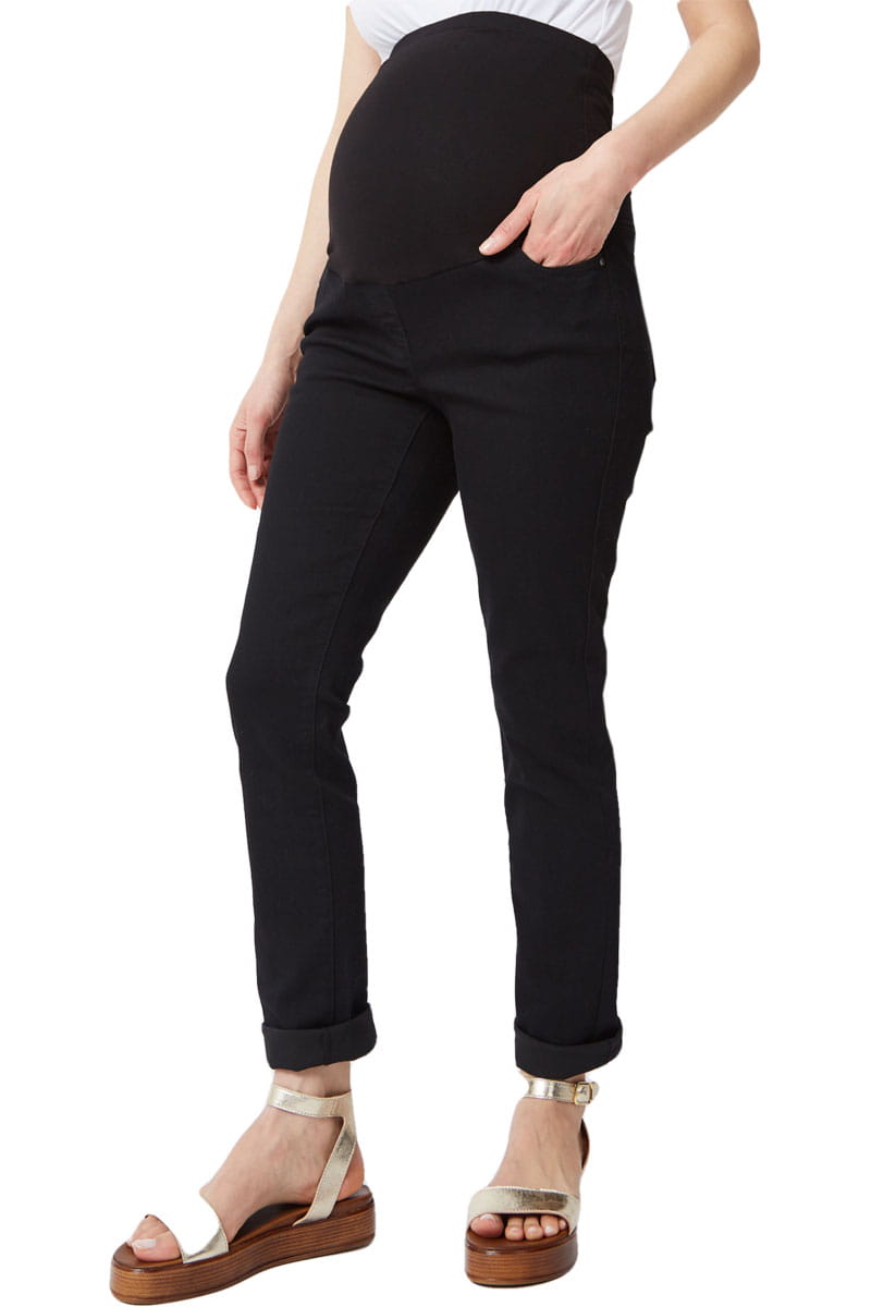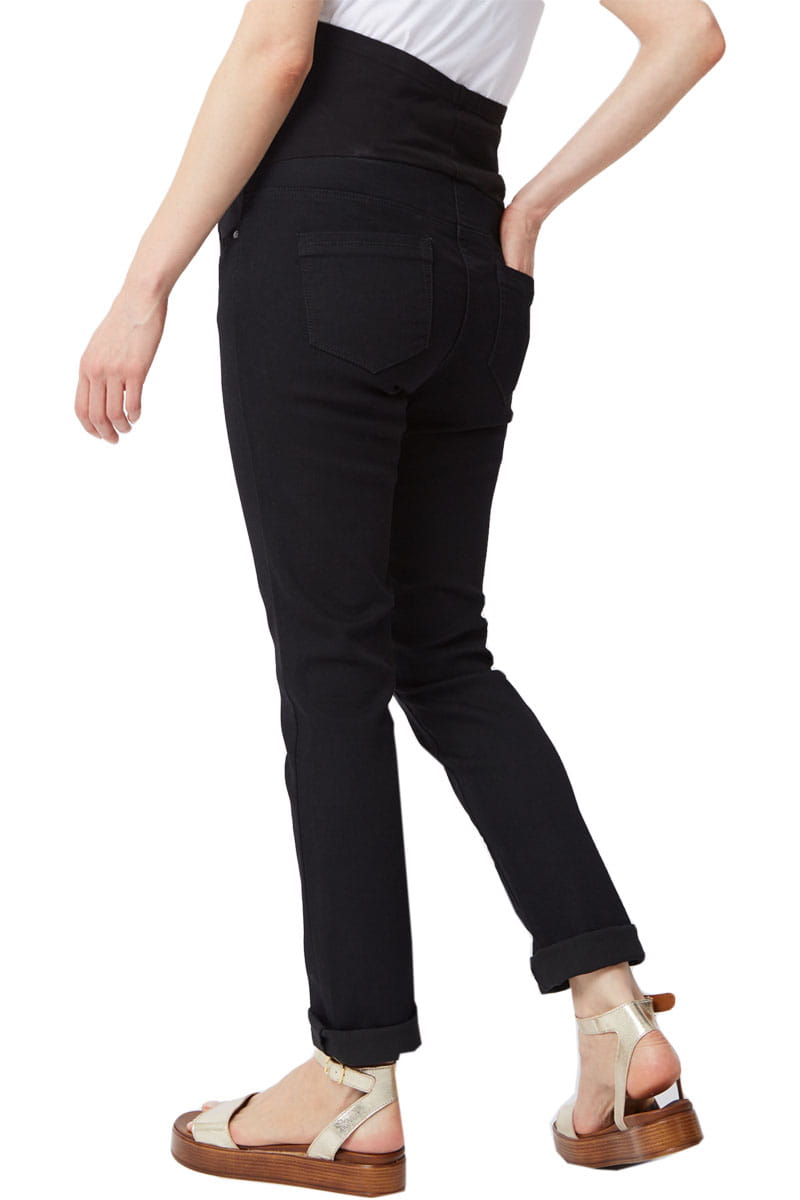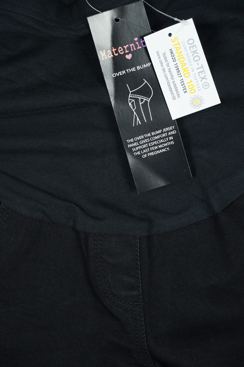 Ciążowe jeansy z organicznej bawełny marki George w kolorze czarnym. Nogawki proste. Model ,,over the bump". Jeansy z elastycznym czarnym panelem, dostosowującym się do zmieniającego się ciała przyszłej mamy. Jerseyowy panel nad brzuszkiem zapewnia komfort i wsparcie zwłaszcza w ostatnich miesiącach ciąży. U góry panelu wszyta gumka zapobiegająca zsuwaniu się. Z przodu dwie kieszenie i jedna mała kieszeń, oraz dwie kieszenie z tyłu.