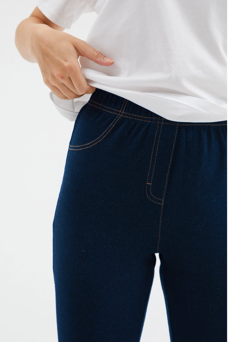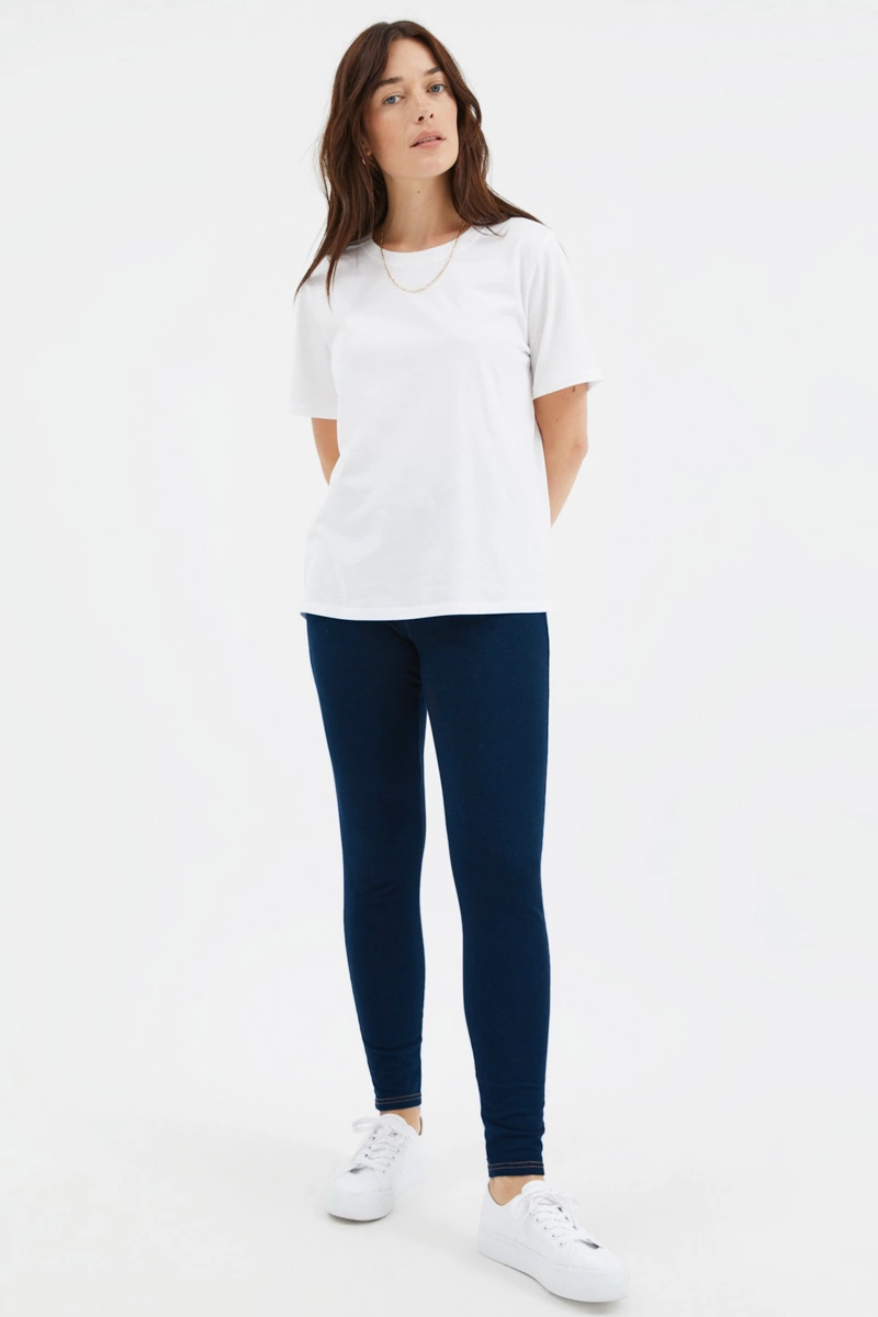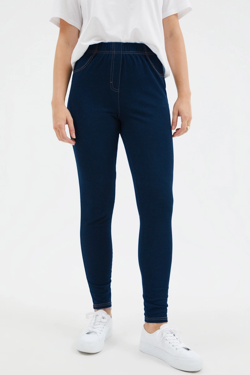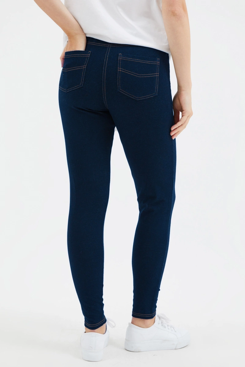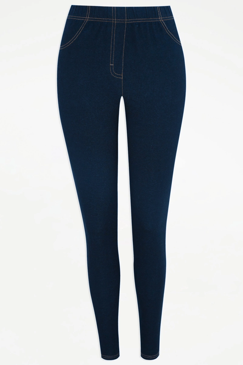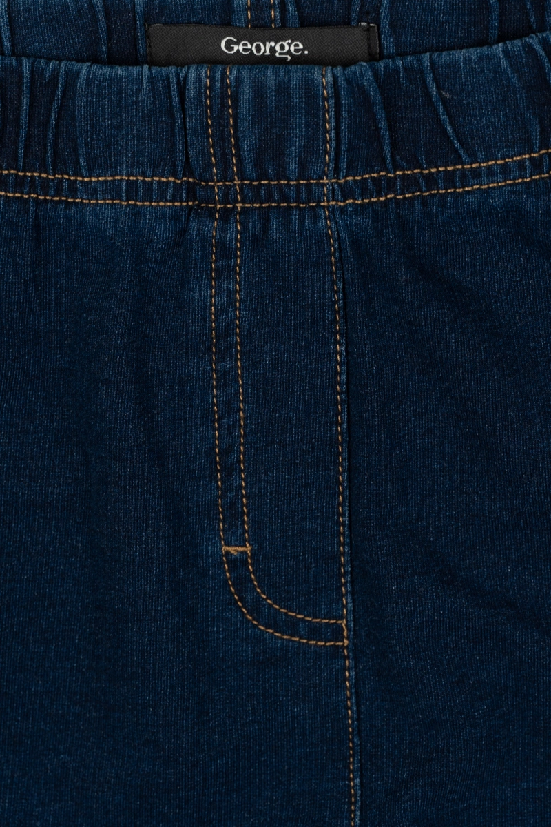 Jegginsy marki George w odcieniu granatowym. Model rurki. W pasie wszyta gumka, dzięki której dopasowują się do sylwetki. Wysokość stanu - średni. Wykonane z miłego i rozciągliwego materiału, zapewniając dopasowany krój. Z przodu imitacje kieszeni i zamka z tyłu dwie kieszenie.