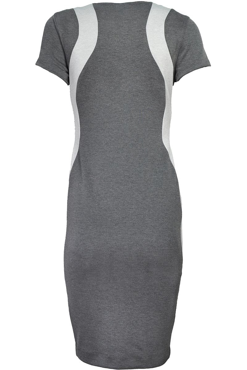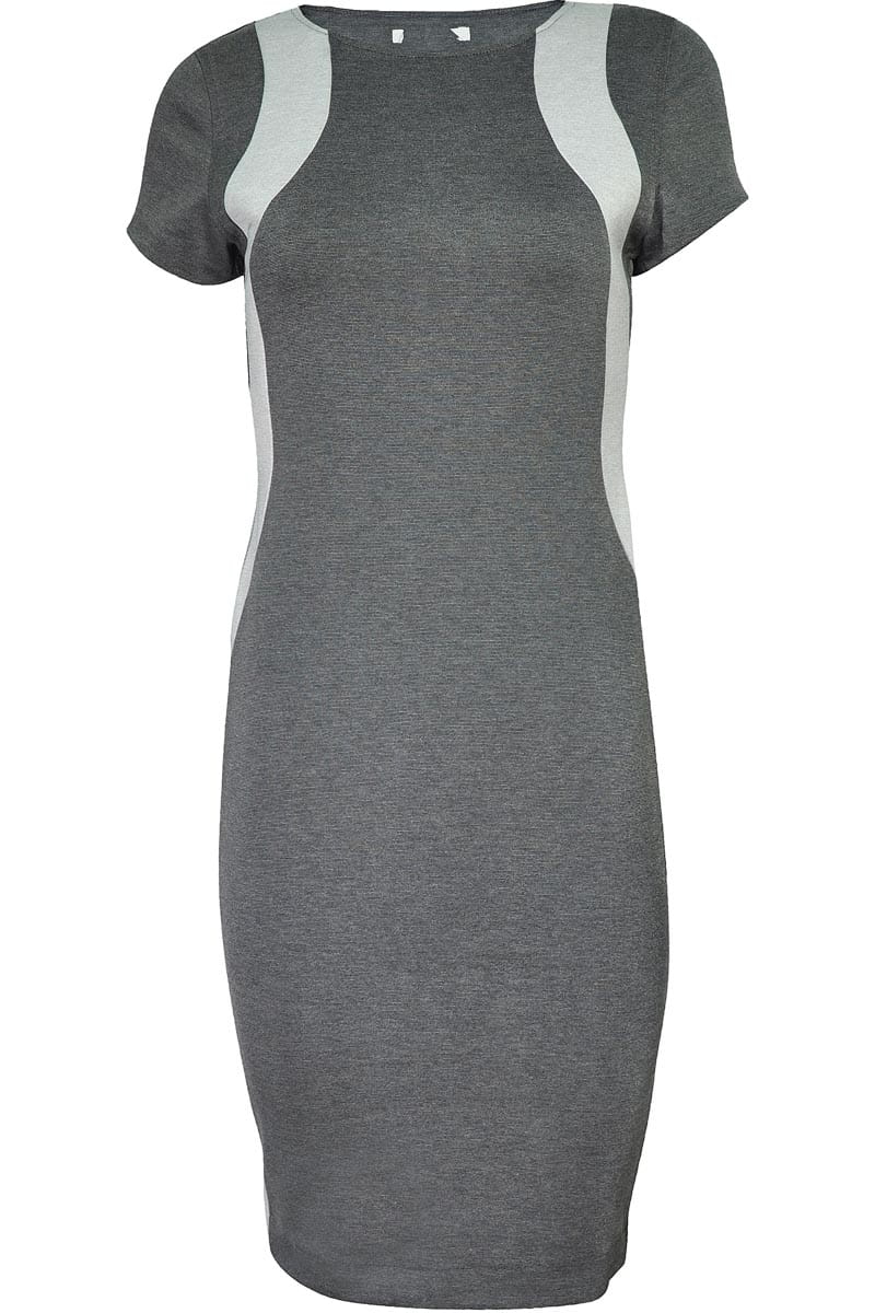Sukienka firmy Peacocks, w odcieniu grafitowym z siwymi wstawkami. Na krótki rękaw. Sukienka długości midi, dopasowana. Uszyta z elastycznego materiału, dopasowuje się do sylwetki. Materiał wysokogatunkowy i miły w dotyku.