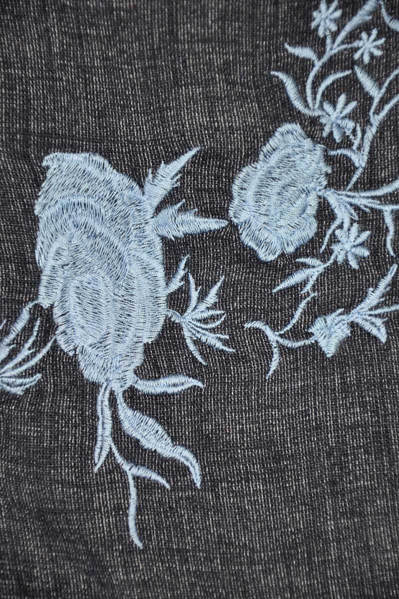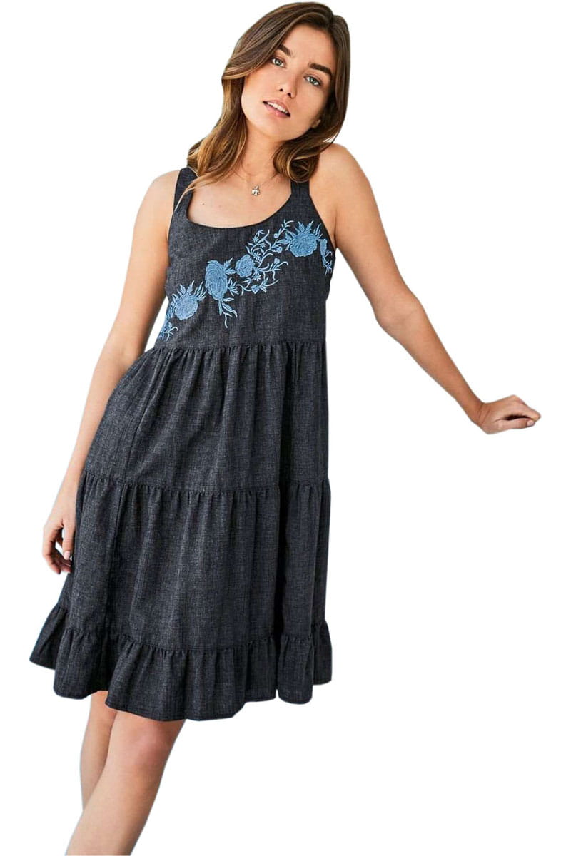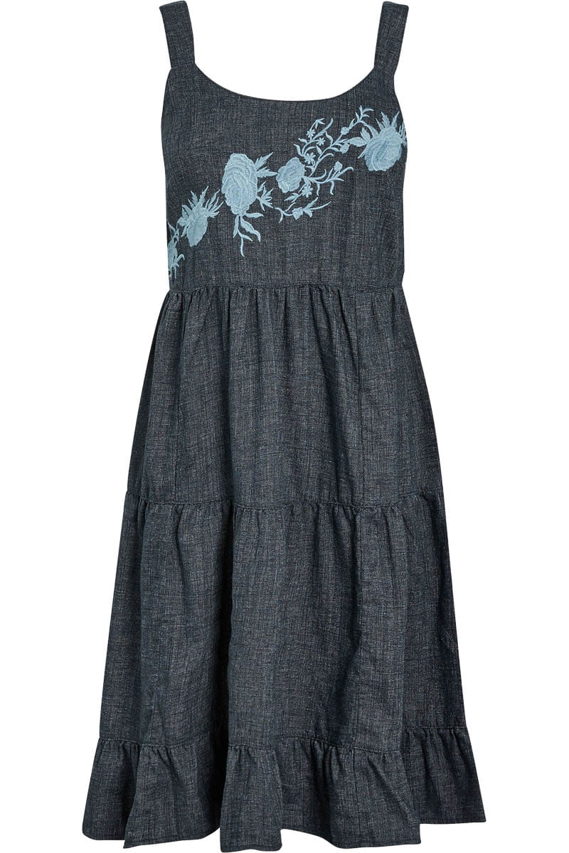 Lniana sukienka marki Next w odcieniu grafitowym. Na ramiączkach. Z tyłu zapinana na guzik a'la łezka. Z przodu i z tyłu posiada wyhaftowane kwiaty. Dół posiada przeszycia i zakończony jest falbanką. Odcinana pod biustem.