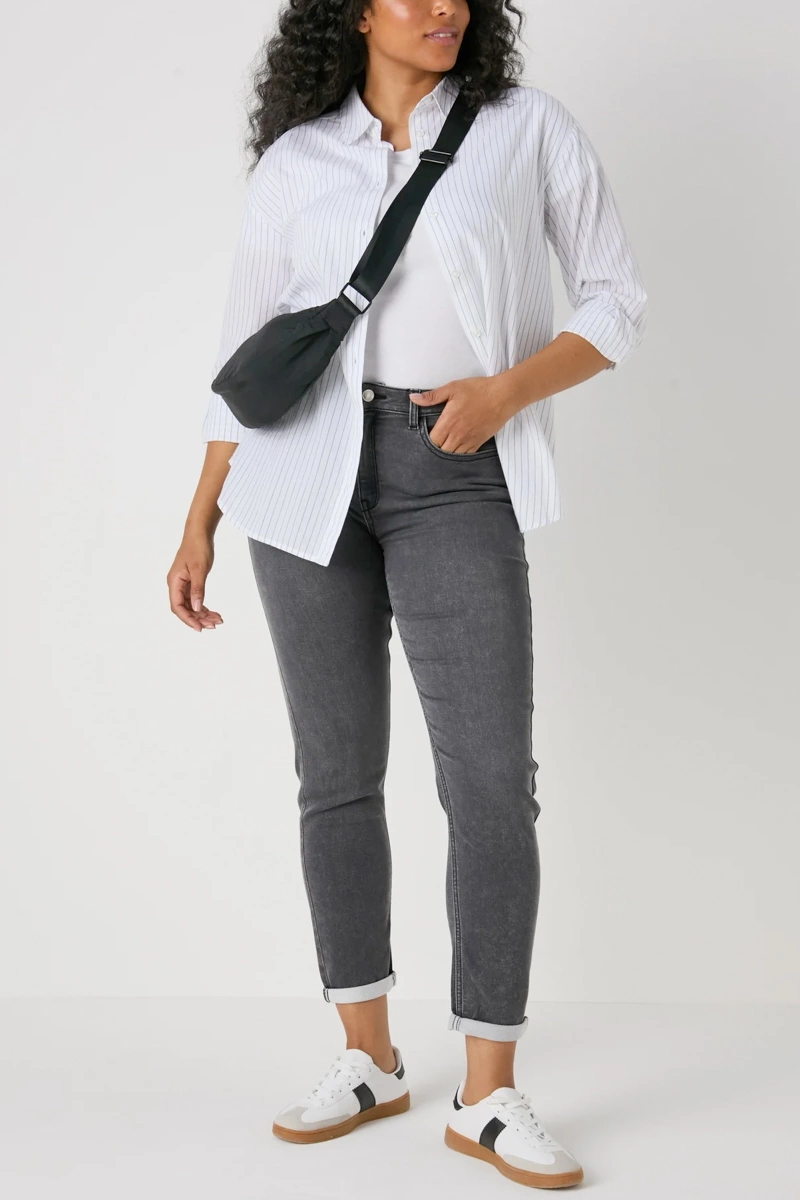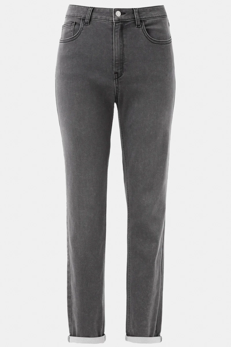 Jeansy marki Papaya w odcieniu grafitowym. Długość Regular. Model Jolie Relaxed Skinny. Średni stan. Krój dopasowany. Nogawki proste. Zapinane na guzik i zamek. Szlufki w pasie. Z przodu dwie duże kieszenie i jedna mała kieszeń oraz dwie kieszenie z tyłu.
