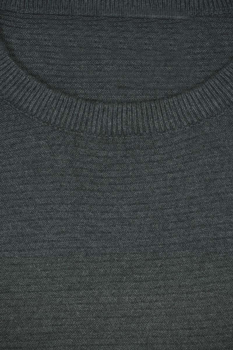 Męski markowy prążkowany sweter w odcieniu grafitowym. Dekolt okrągły. Rękawy długie, zakończone ściągaczem. Dół swetra zakończony ściągaczem.
