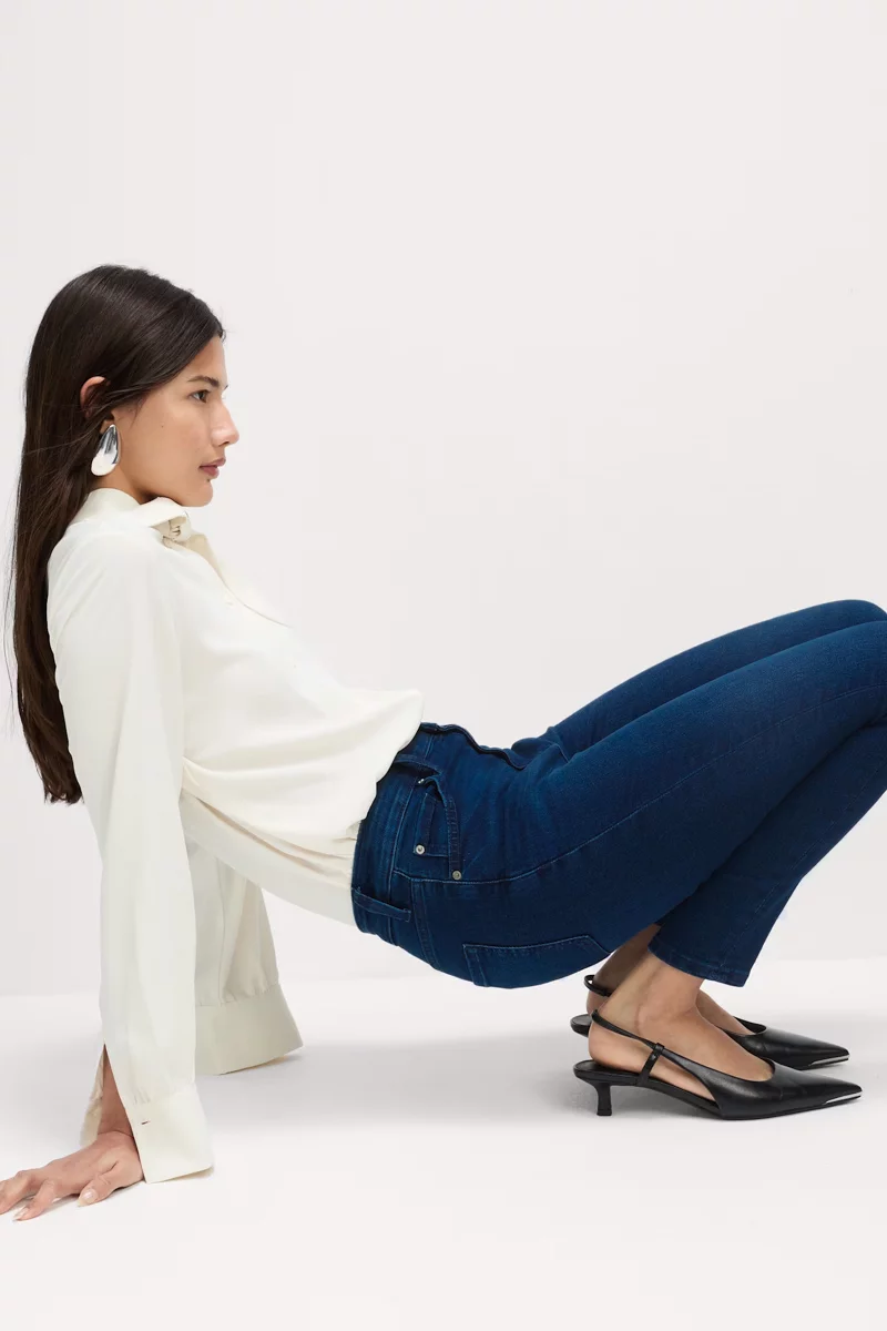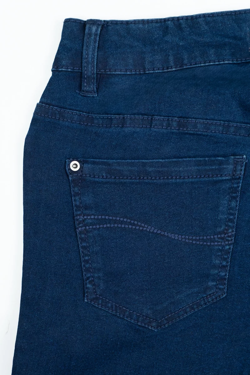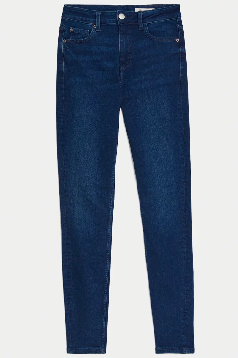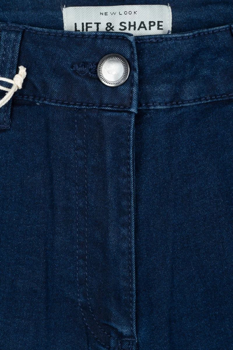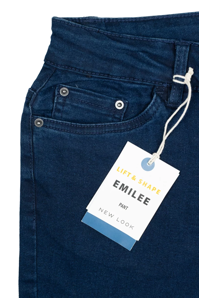 Jeansy firmy New Look w odcieniu granatowym. Długość Regular. Model Emilee. Dopasowany krój, tworzy elegancką, smukłą sylwetkę, która optycznie wydłuża nogi. Nogawki lekko zwężane. Elastyczny denim z domieszką stretchu zapewnia wygodę przez cały dzień. Wysokość stanu średnia. Zapinane na guzik i zamek. Szlufki w pasie. Z przodu dwie duże kieszenie i jedna mała kieszeń oraz dwie kieszenie z tyłu.