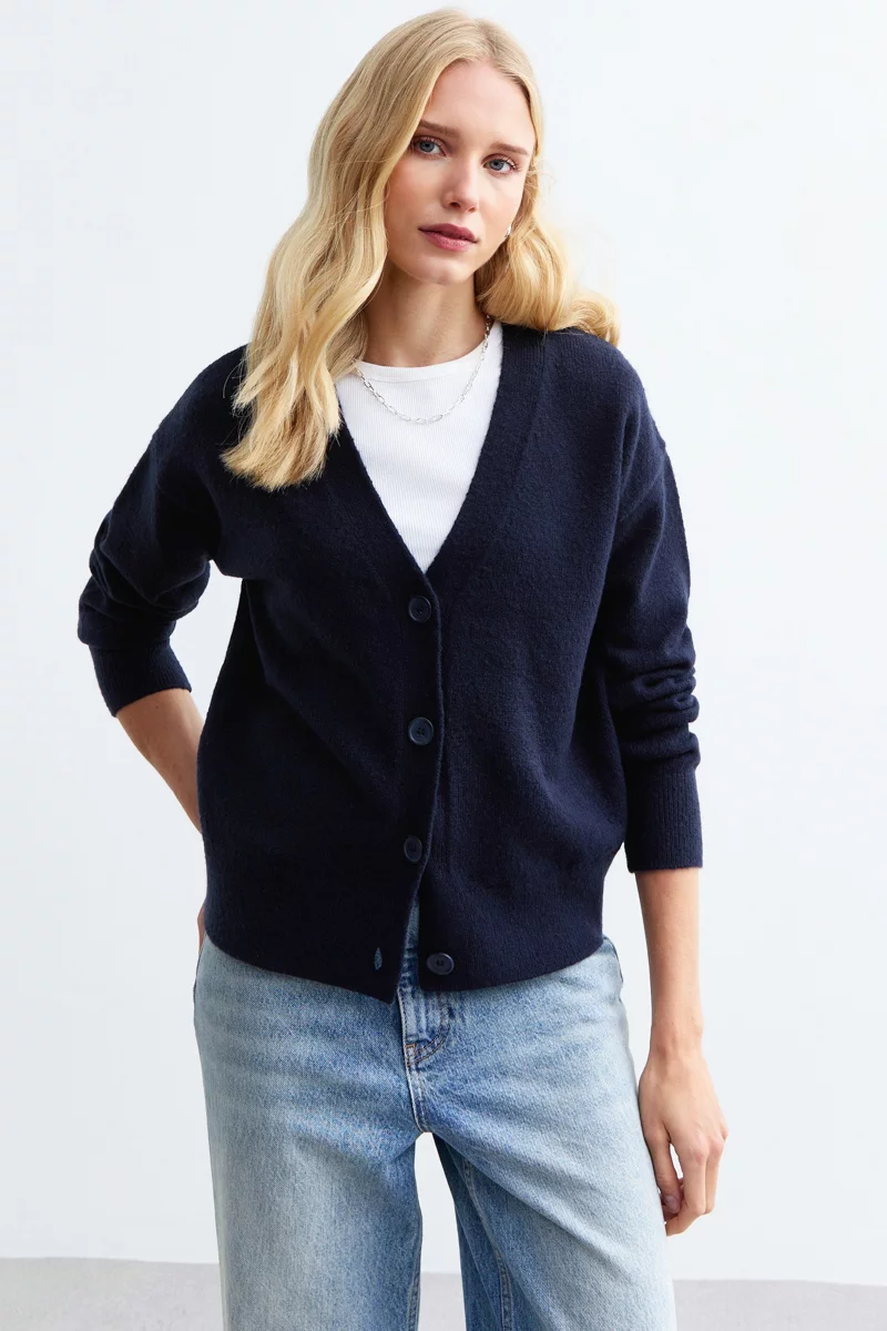 Dzianinowy kardigan firmy New Look w odcieniu granatowym. Zapinany z przodu na granatowe guziki. Na długi rękaw, zakończony ściągaczem. Linia ramion obniżona. Materiał dzianinowy o średniej grubości. Krój luźny. Dekolt w szpic. Dół swetra zakończony ściągaczem.