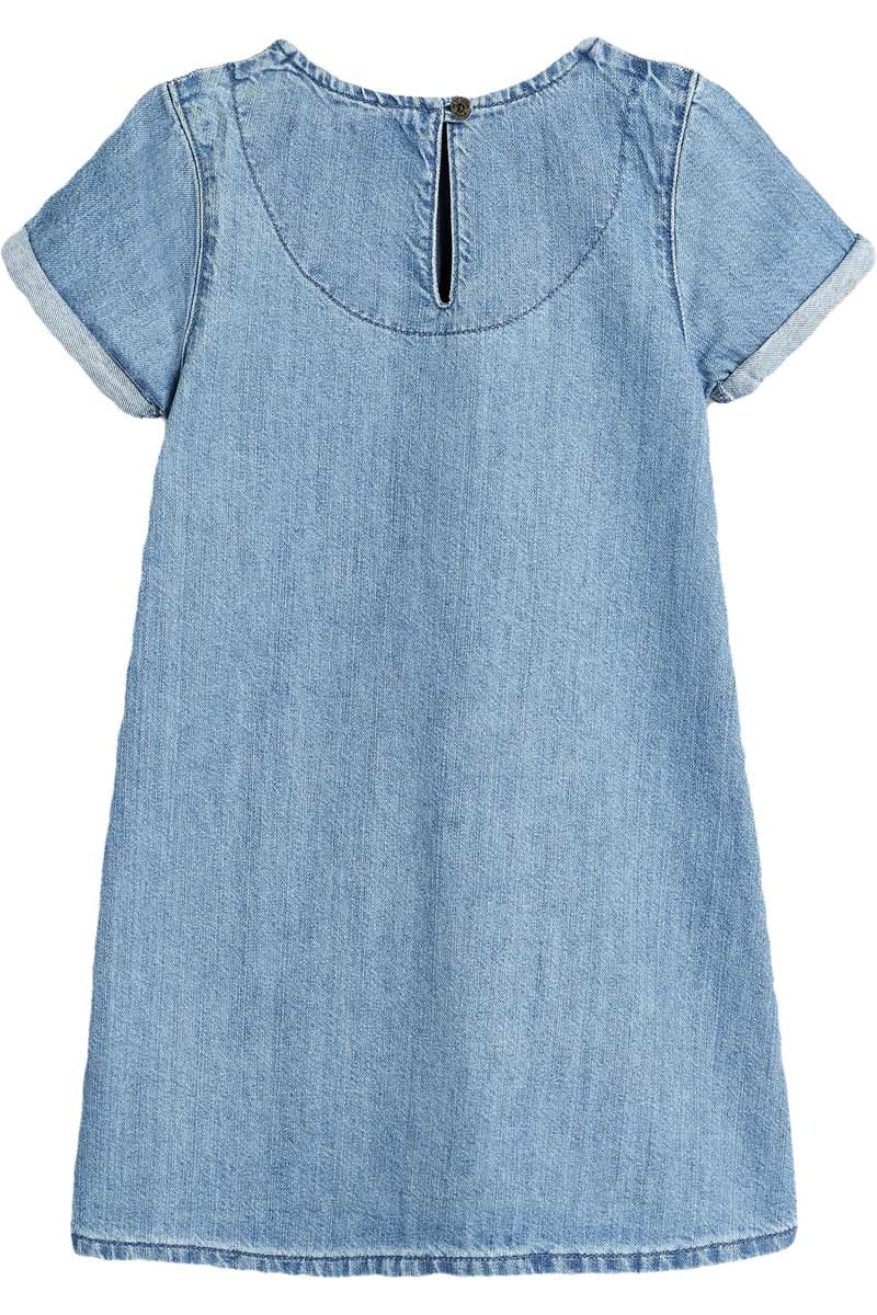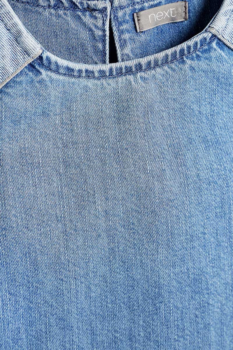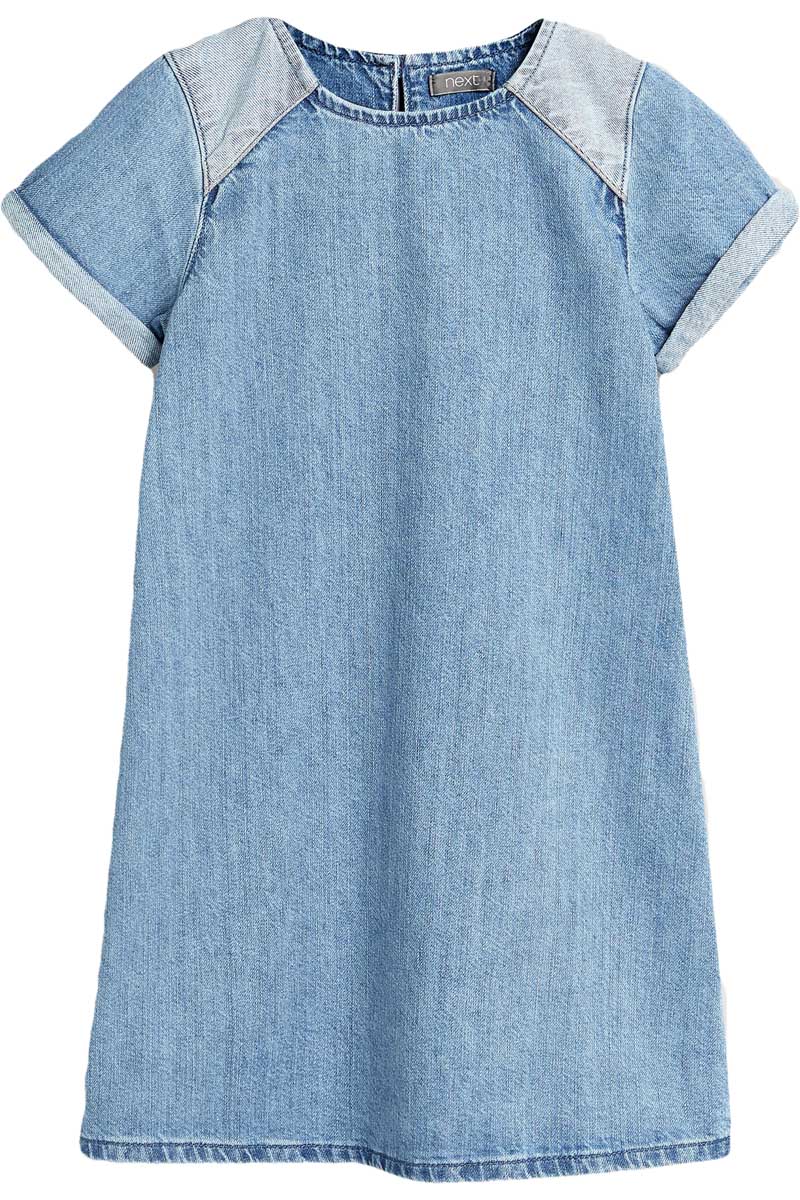 Bawełniana jeansowa Sukienka/Tunika marki Next. Na krótki, podwinięty rękaw. Dekolt prostokątny. Z tyłu zapinana na guzik a'la łezka. Na ramionach wstawki z jaśniejszego jeansu. Materiał wysokogatunkowy.