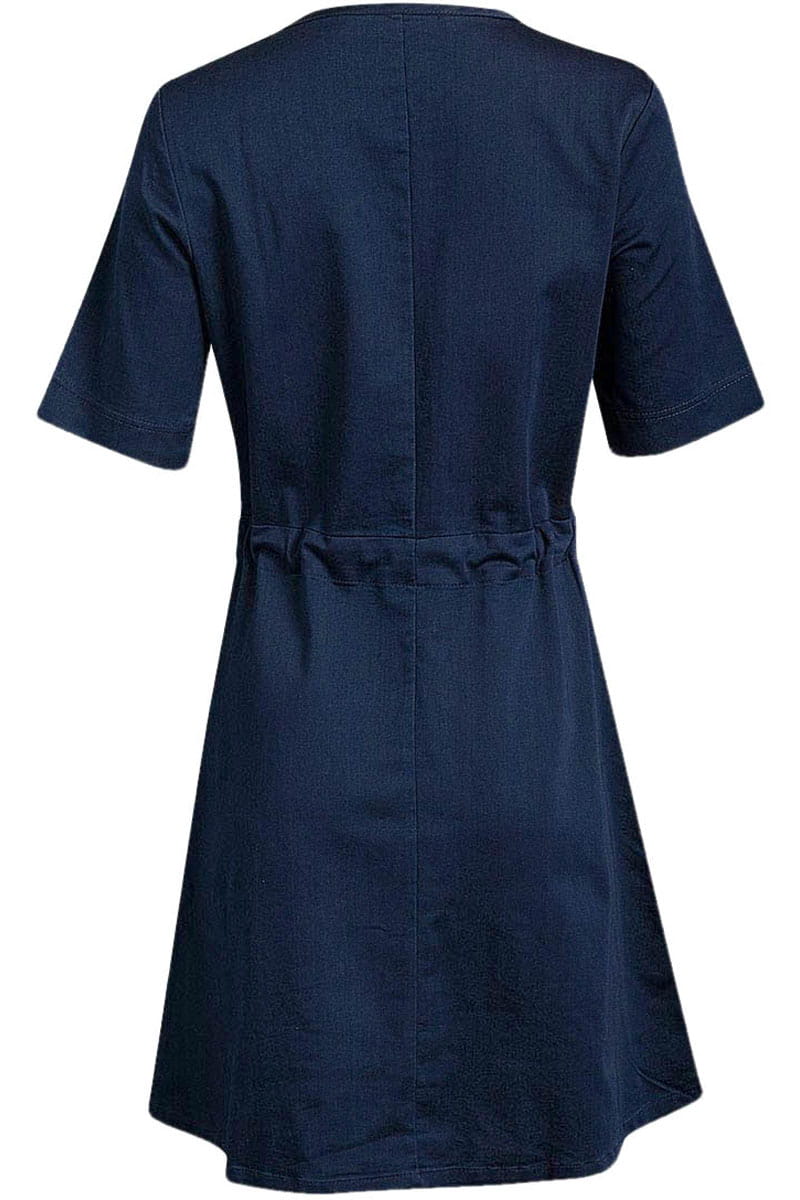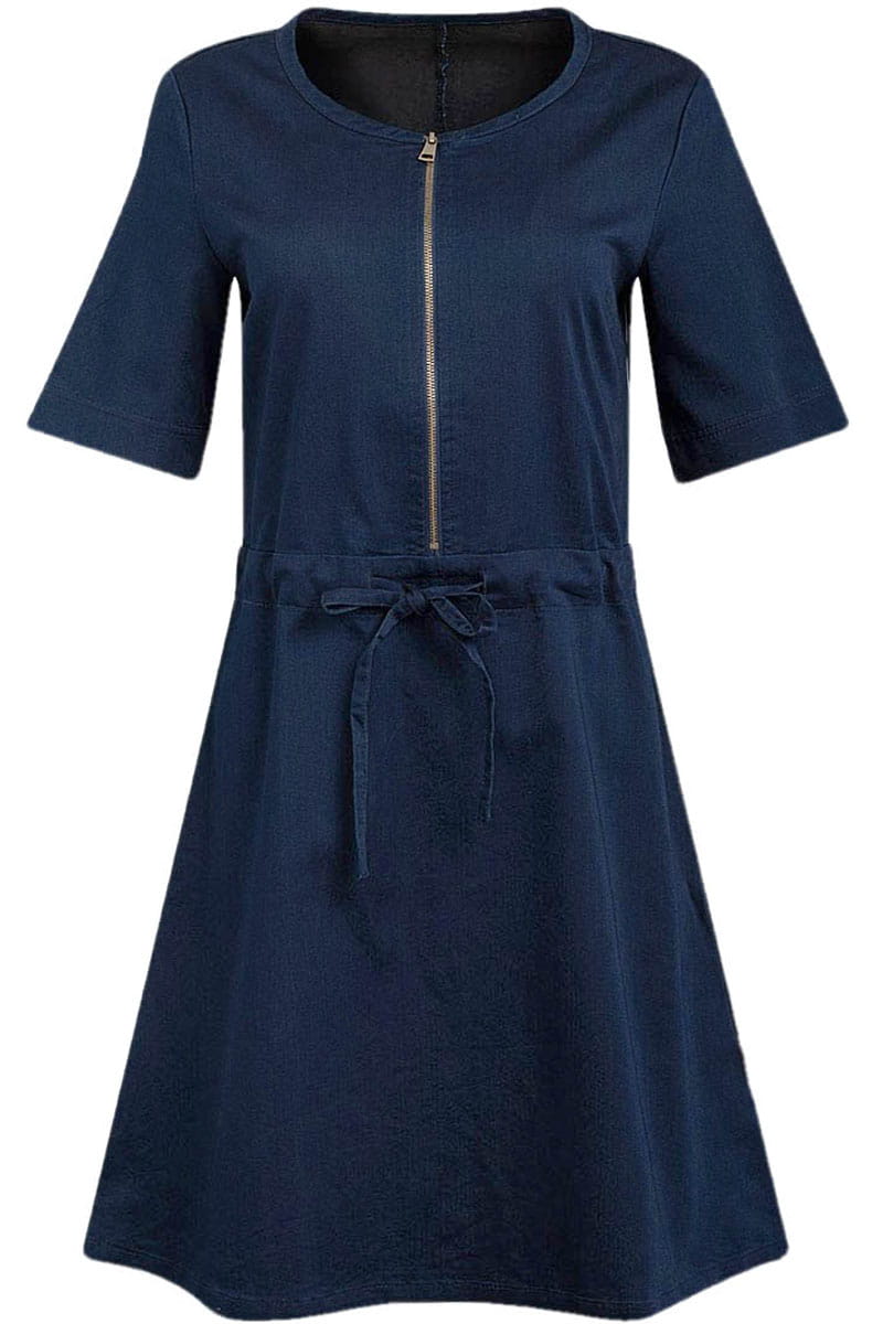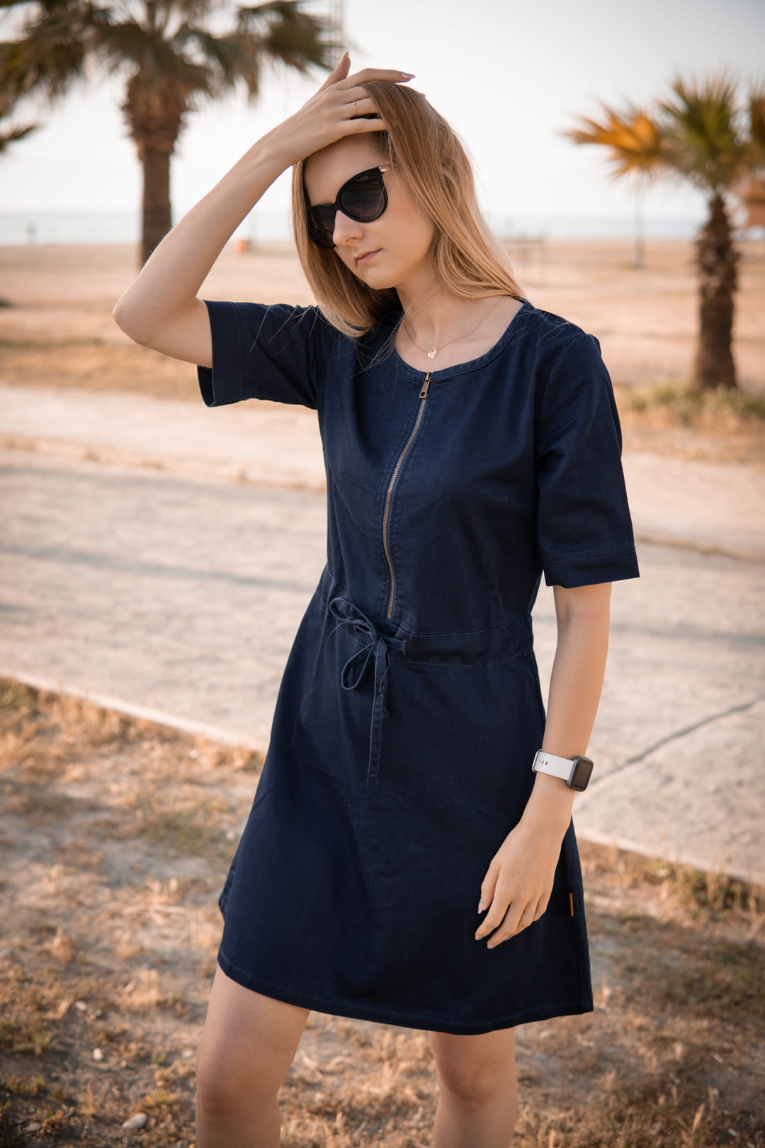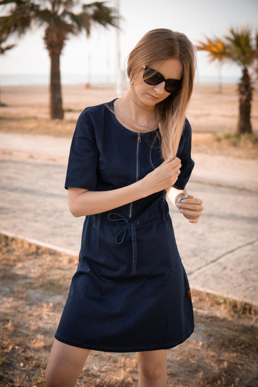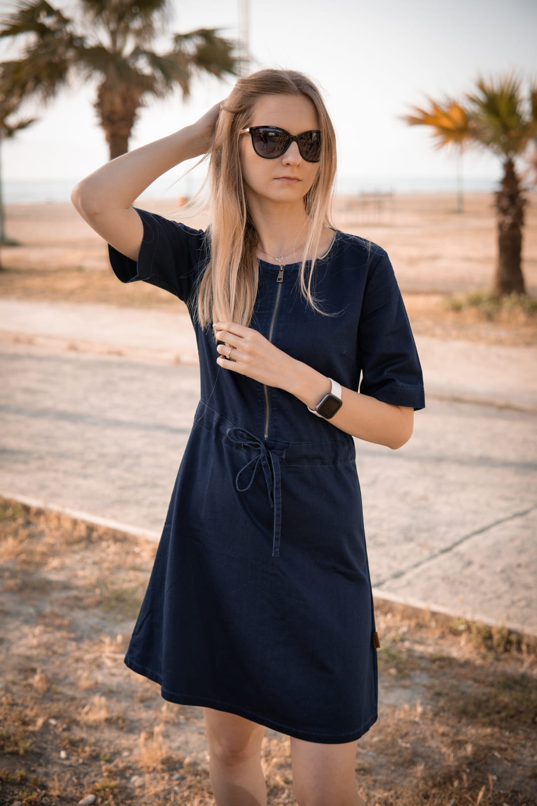 Jeansowa sukienka marki Avon w odcieniu granatowym. Długość - przed kolana. Sukienka na krótki rękaw. Z przodu zapinana na zamek. Dekolt okrągły. W pasie ściągana. Dół lekko rozkloszowany.