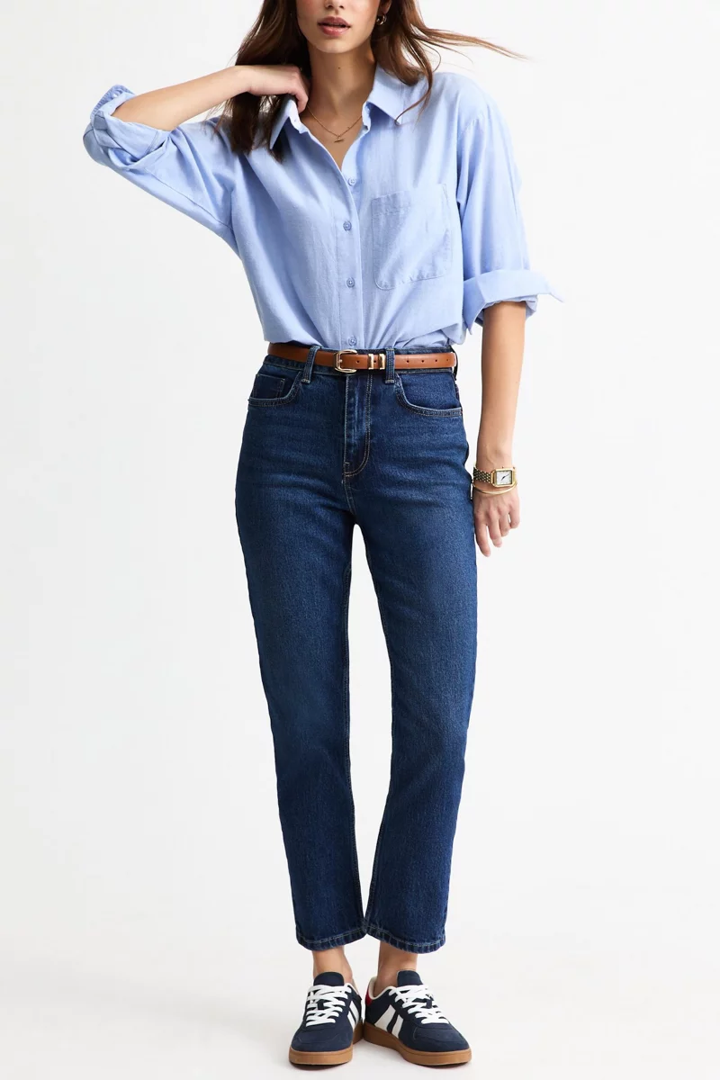 Bawełniane jeansy marki New Look w odcieniu granatowym. Długość Regular. Model Hannah, Straight Leg, Ankle Grazer. Zapinane na guzik i zamek. W pasie szlufki. Wysokośc stanu - średni. Z przodu dwie, duże kieszenie, jedna mała kieszeń oraz dwie kieszenie z tyłu. Nogawki proste, do kostek.
