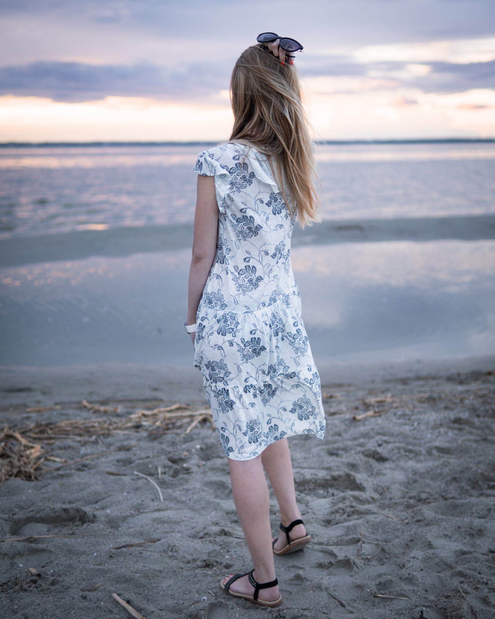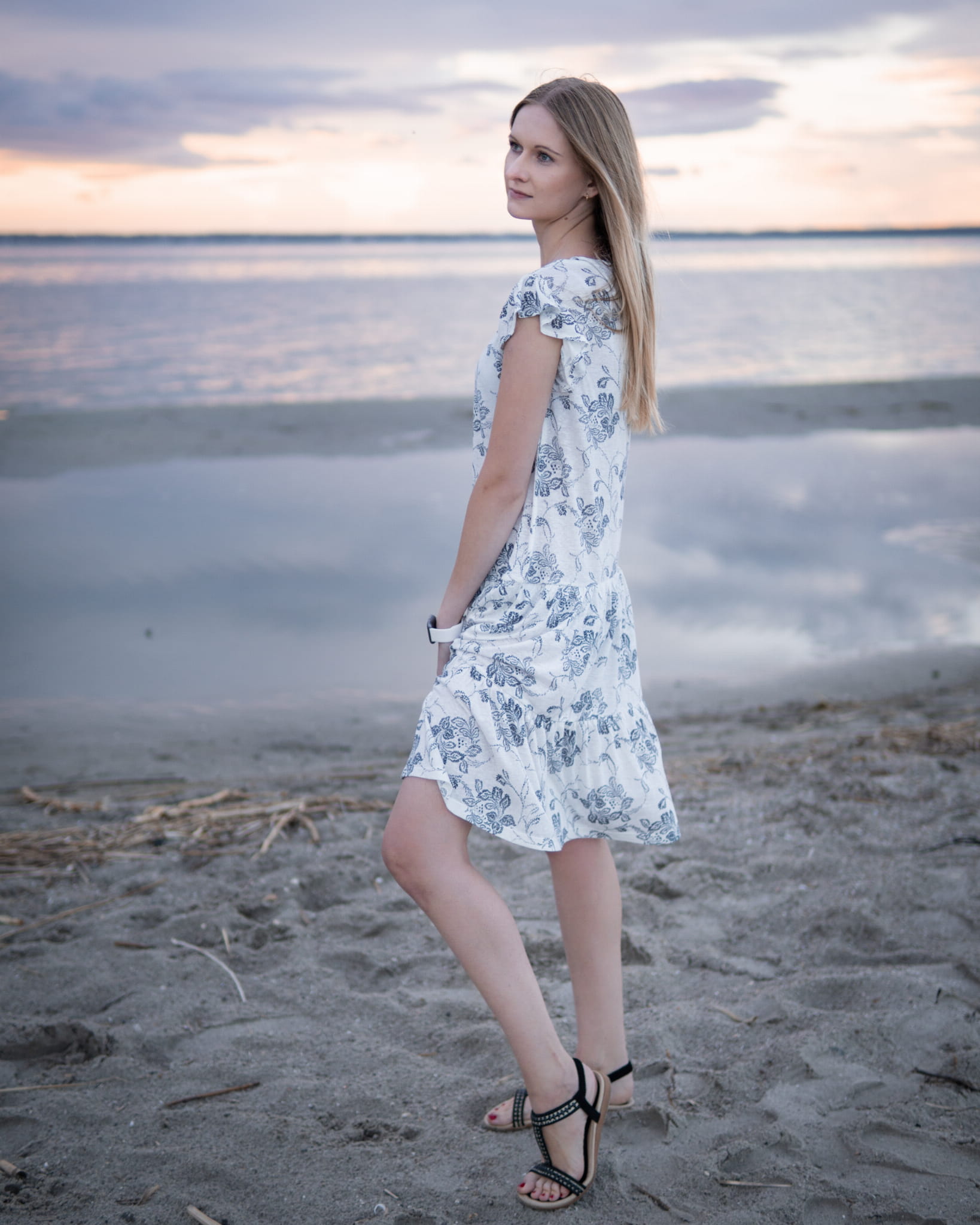 Luźna, lniana sukienka firmy Next w odcieniu kremowym w kwiaty. Długość - przed kolano. Dekolt w szpic. Rękawy krótkie, zakończone kobiecą falbanką. Odcięcia u dołu tworzące falbankę.