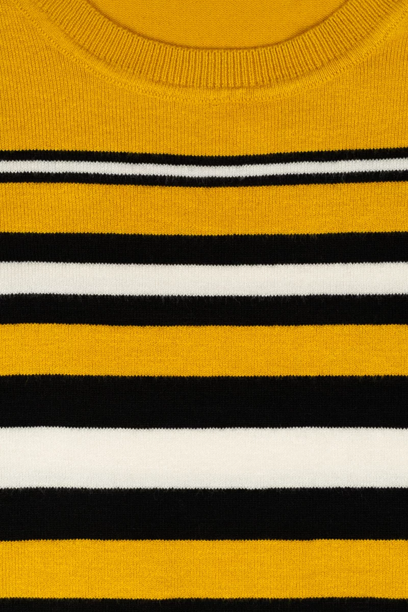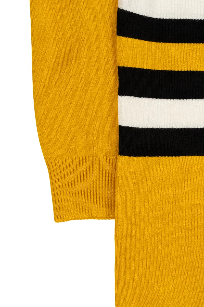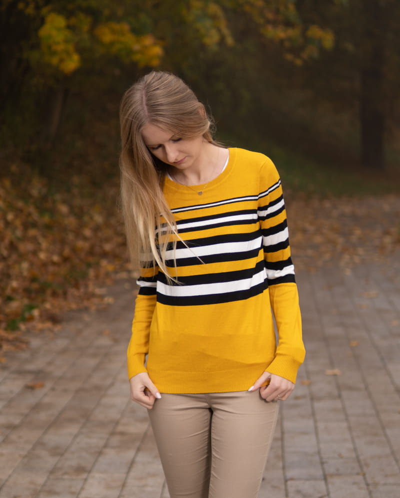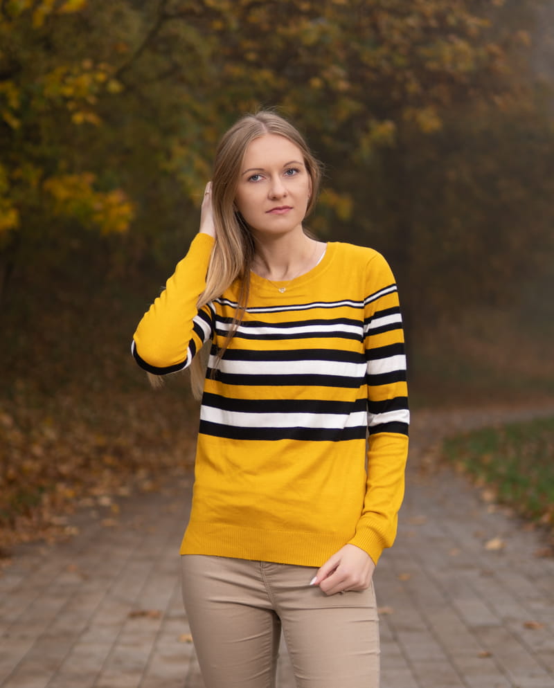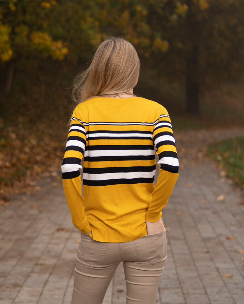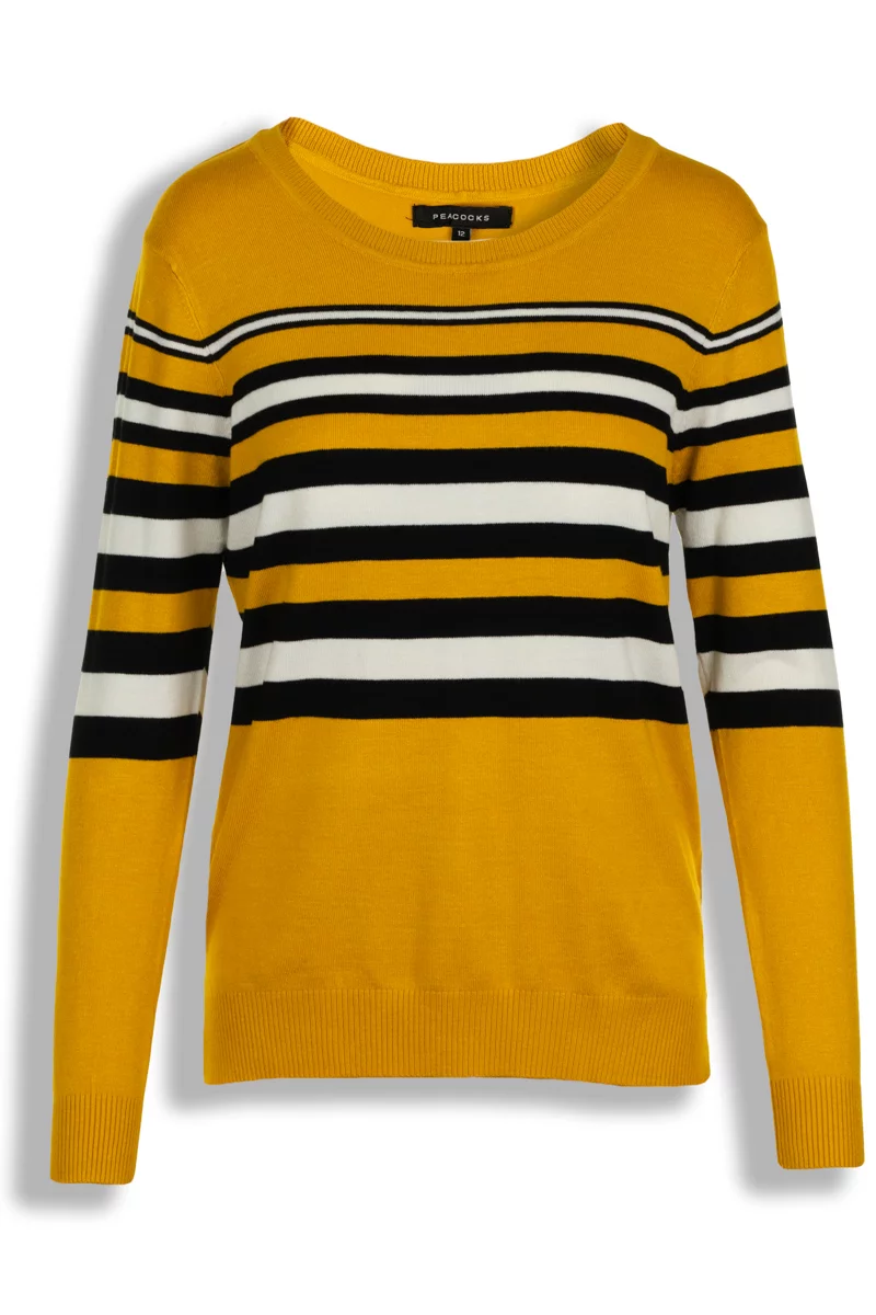 Sweter firmy Peacocks w odcieniu miodowym w czarno-białe pasy. Asymetryczny - o lekko dłuższym tyle. Na długi rękaw. Rękawy oraz dół swetra zakończone ściągaczem. U dołu, po bokach posiada niewielkie rozcięcie materiału - dla lepszego komfortu noszenia. Sweter z okrągłym dekoltem.