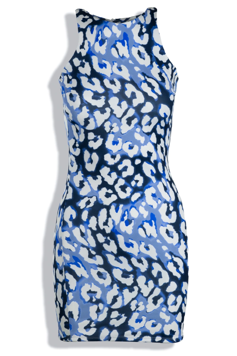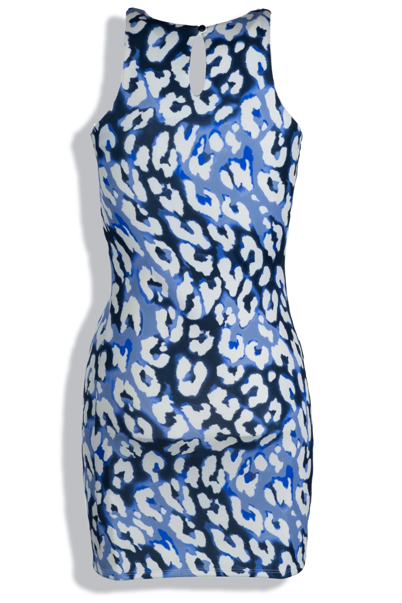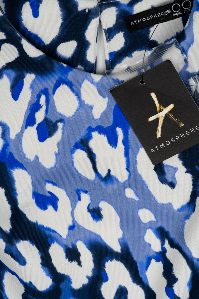 Sukienka firmy Atmosphere w cetki w odcieniu niebieskim, białym i czarnym. Sukienka taliowana. Z tyłu posiada zapięcie na jeden guzik a`la łezka. Uszyta jest z elastycznego materiału, dzięki czemu dobrze dopasowuje się do sylwetki. Materiał dobry gatunkowo i przyjemny w dotyku. Z kompletem firmowych metek Atmopshere.