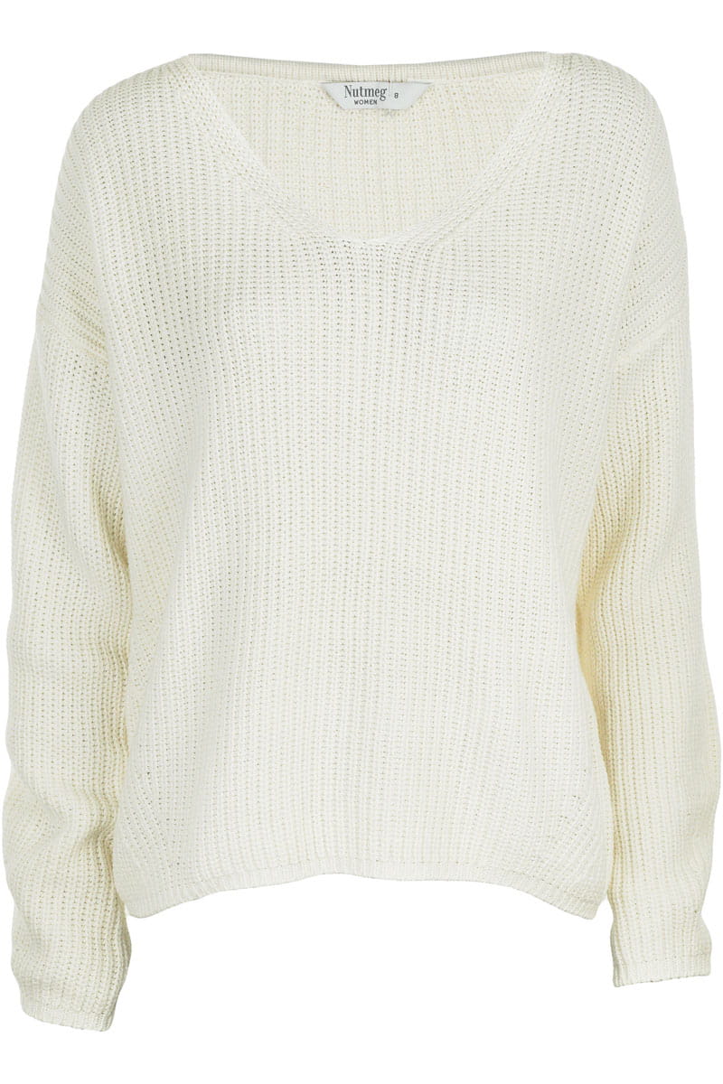 Dzianinowy sweter firmy Nutmeg w odcieniu ecru. Rękawy długie, zakończone niewielkim ściągaczem. Dekolt v-neck. U dołu zakończony niewielkim ściągaczem. Model oversize (luźny).