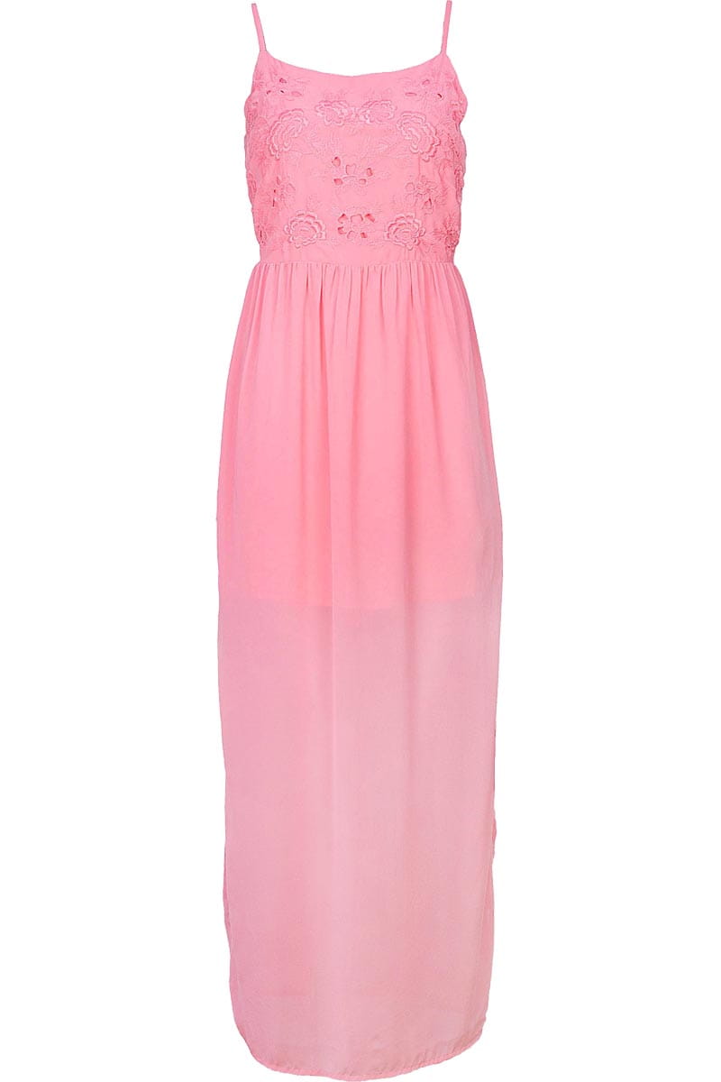 Sukienka firmy New Look, w odcieniu różowym. Sukienka Maxi uszyta jest z szyfonowego materiału. Górę sukienki zdobią wyszywane kwiaty a'la haft. Dół sukienki posiada rozcięcie. Góra sukienki uszyta na podszewce. Sukienka o regulowanych ramiączkach. Odcinana i wiązana w pasie. Z tyłu zapinana na kryty zamek i jedną haftkę. Materiał zwiewny. Z kompletem firmowych metek New Look.