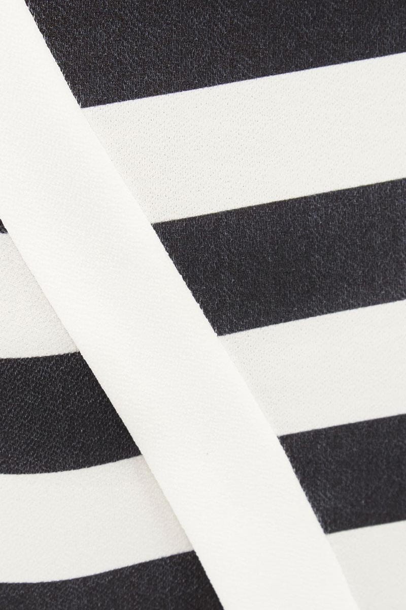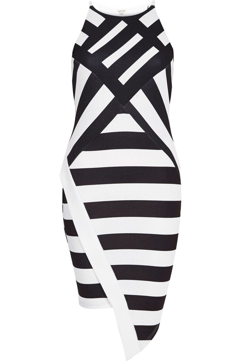 Sukienka firmy River Island. Sukienka w biało czarne pasy. Na ramiączka. Sukienka o nowoczesnym wyglądzie, asymetryczna - dłuższy przód. Jej asymetryczne wzornictwo sprawia, że jest elegancka i wyrafinowana. Dekolt okrągły. Góra sukienki uszyta na białej podszewce. Sukienka uszyta z elastycznego materiału, dobrze dopasowuje się do sylwetki.