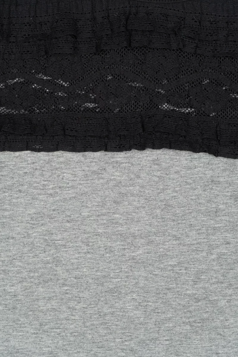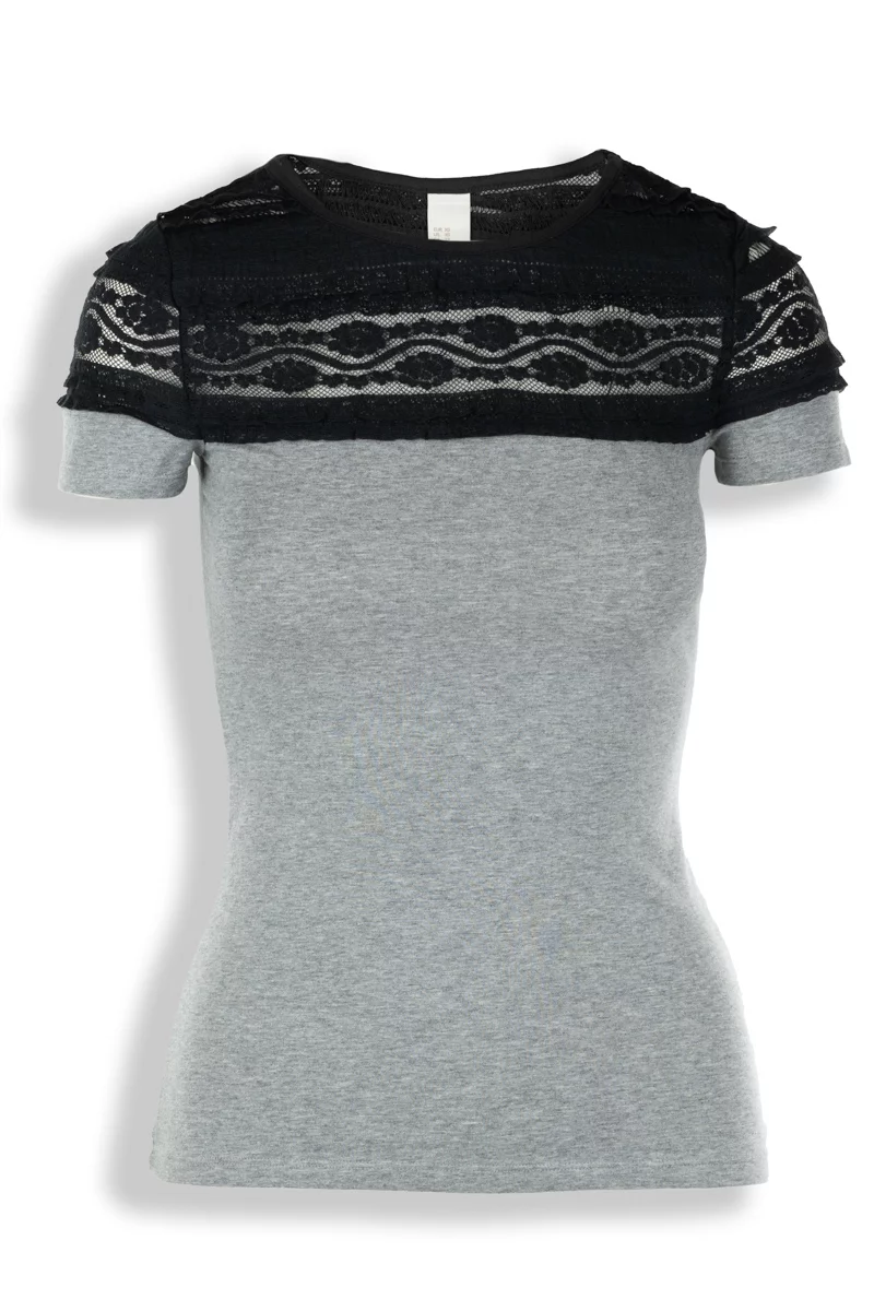 Bluzka firmy H&M. Bluzka w odcieniu szarym z czarną koronką. Na krótki rękaw. Góra bluzki oraz ramiona zostały wykończone misterną, czarną koronką. Lekka, miła w dotyku i idealnie dopasowująca się do figury.