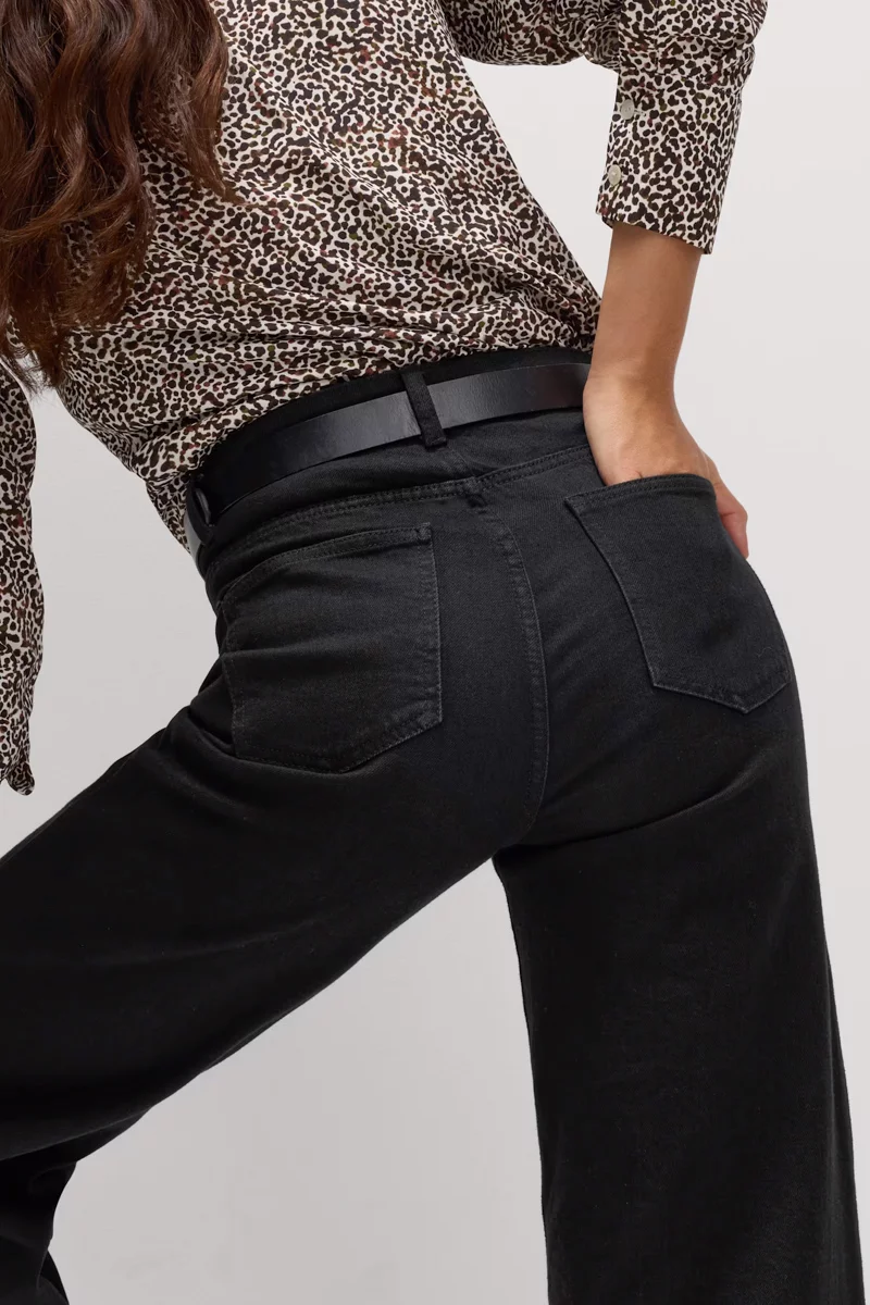 Jeansy firmy Marks&Spencer w kolorze czarnym. Długość Regular. Model Wide (szerokie nogawki). Jeansy, wykonane z mieszanki wysokiej jakości materiałów. Zapinane na zamek i guzik. Wysoki stan, podkreśla talię i optycznie wydłuża nogi, a luźne nogawki zapewniają komfort i swobodę ruchów przez cały dzień. Szlufki w pasie. Z przodu dwie głębokie kieszenie, jedna mała kieszeń oraz dwie kieszenie z tyłu. Wysokiej jakości denim (bawełna z dodatkiem elastanu).