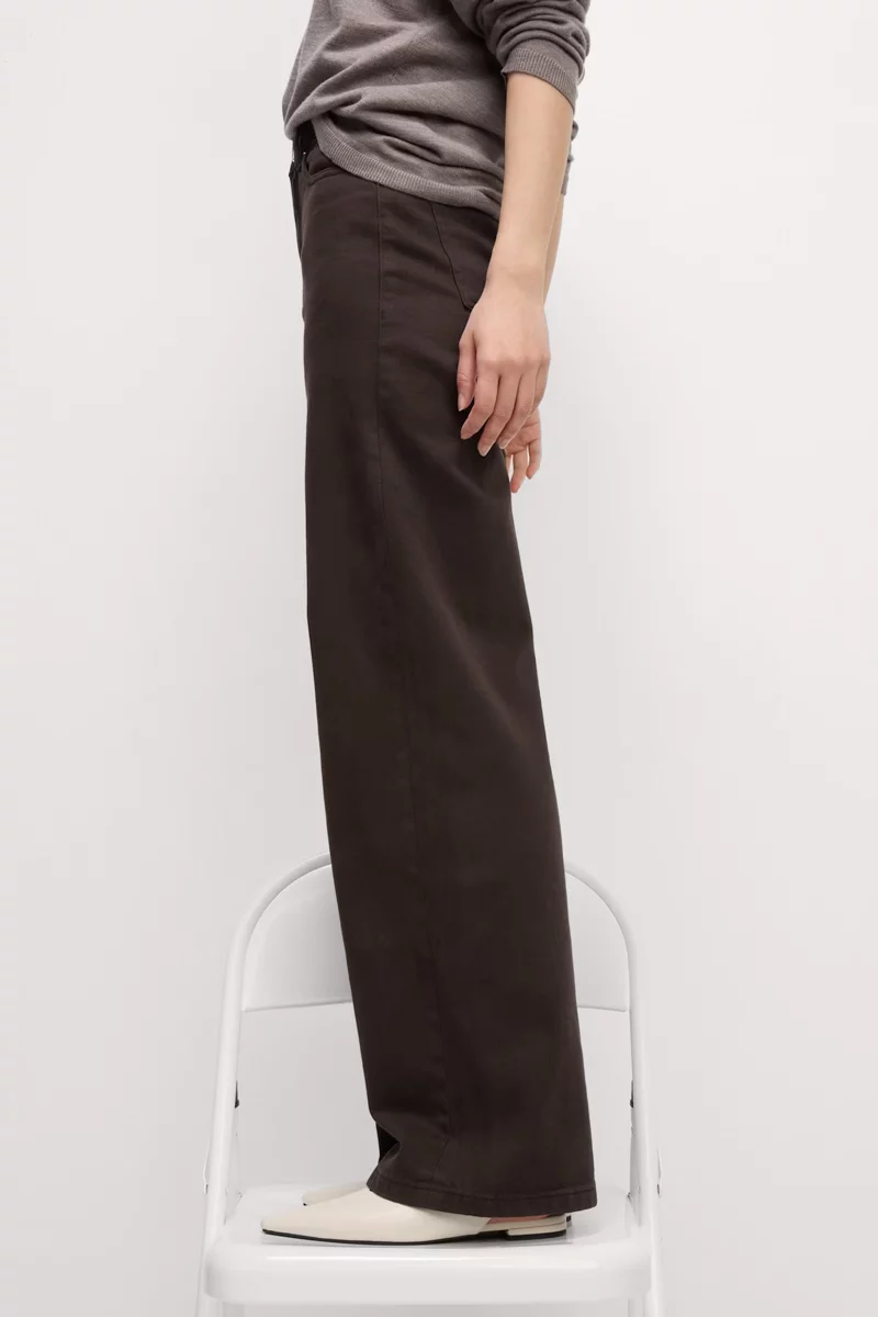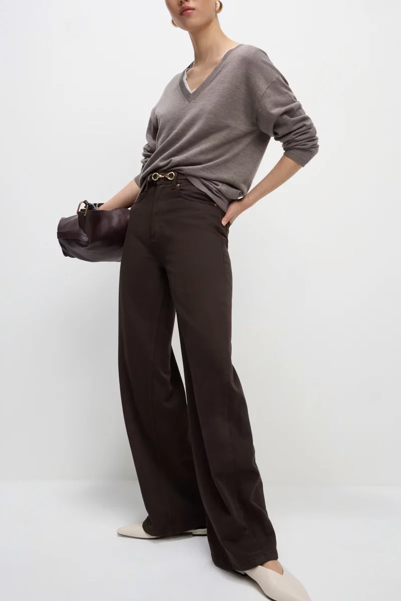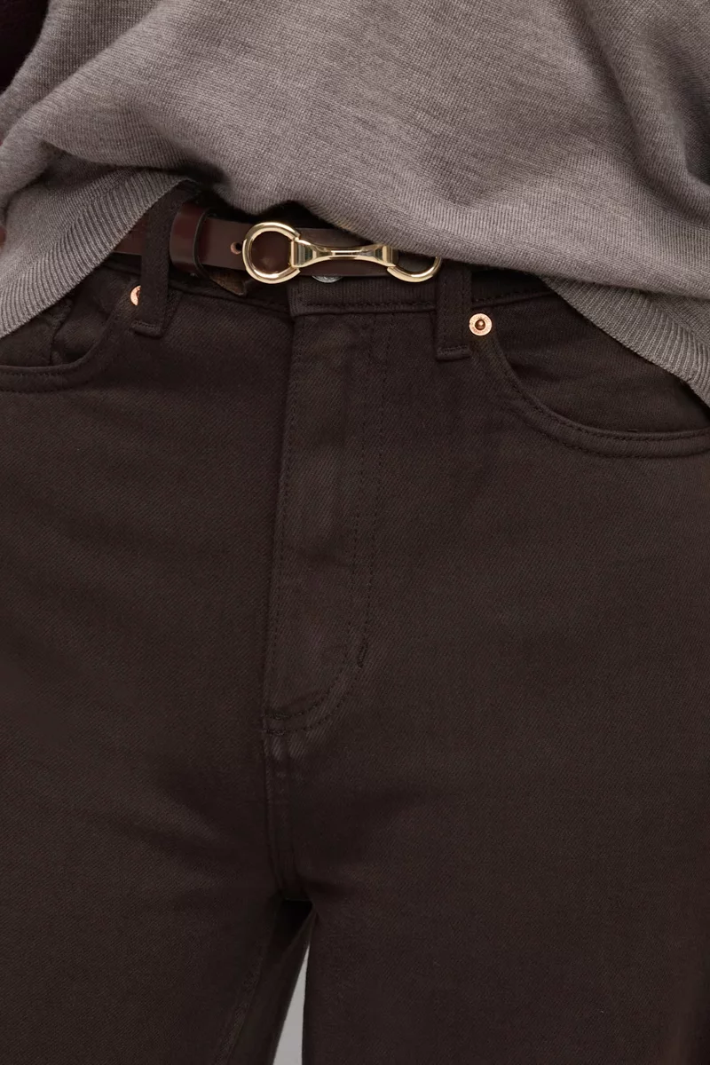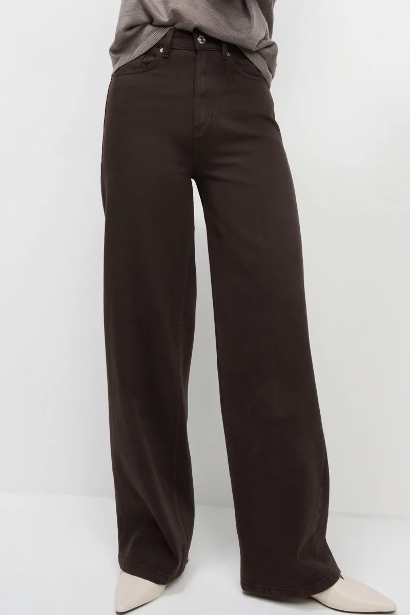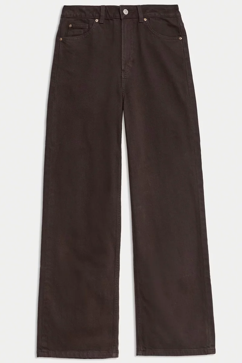Jeansy firmy Marks&Spencer w odcieniu kasztanowym. Długość Short. Model Wide (szerokie nogawki). Jeansy, wykonane z mieszanki wysokiej jakości materiałów. Zapinane na zamek i guzik. Wysoki stan, podkreśla talię i optycznie wydłuża nogi, a luźne nogawki zapewniają komfort i swobodę ruchów przez cały dzień. Szlufki w pasie. Z przodu dwie głębokie kieszenie, jedna mała kieszeń oraz dwie kieszenie z tyłu. Wysokiej jakości denim (bawełna z dodatkiem elastanu).