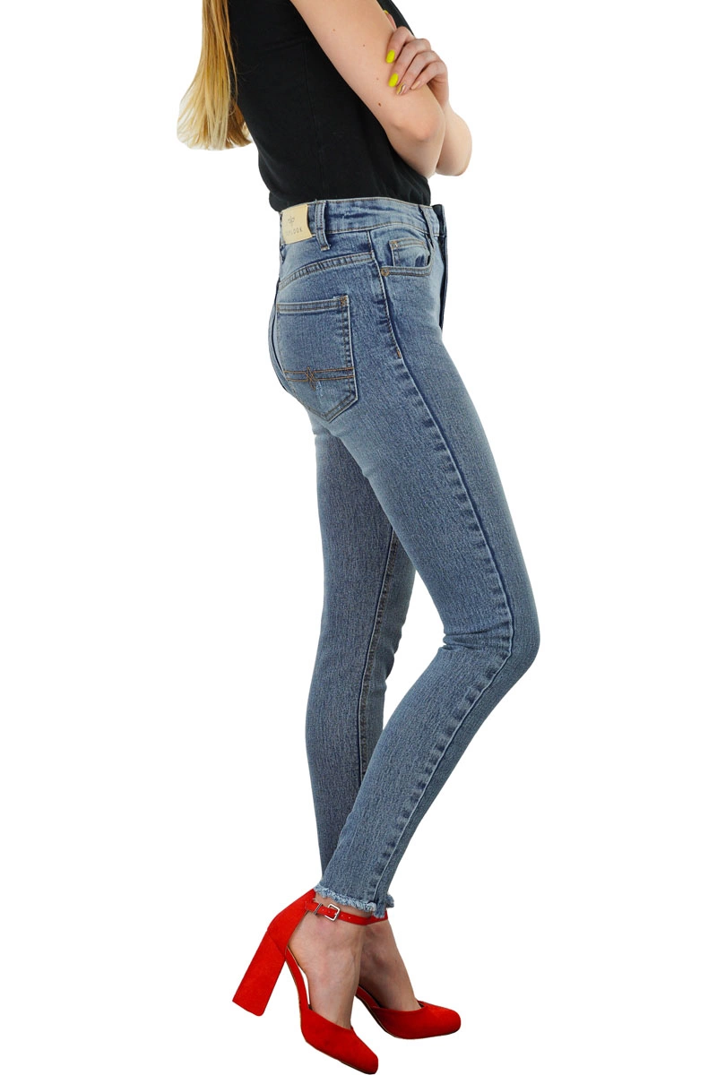 Jeansy marki Toplook w odcieniu niebieskim. Model Popy. Długość Regular. Zapinane na zamek i guzik. Jeansy skinny (rurki) o postrzępionych nogawkach u dołu. W pasie szlufki. Trzy kieszenie z przodu w tym jedna mała kieszeń. Z tyłu dwie kieszenie z modnymi przetarciami. Wysokość pasa-średnia.