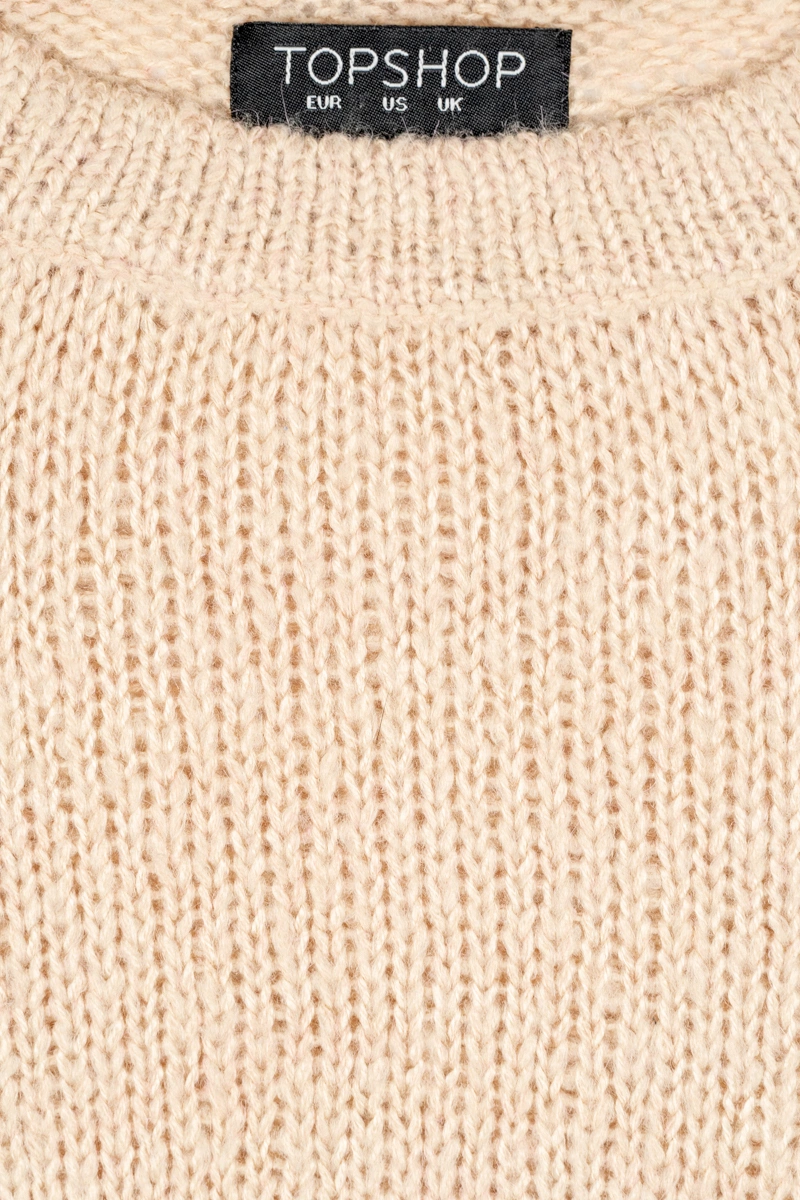 Sweter firmy Topshop w odcieniu beżowym. Materiał dzianinowy. Długie, poszerzane rękawy, zakończone ściągaczem. Dekolt okrągły. Dół swetra zakończony ściągaczem. Sweter luźny pod pachami.
