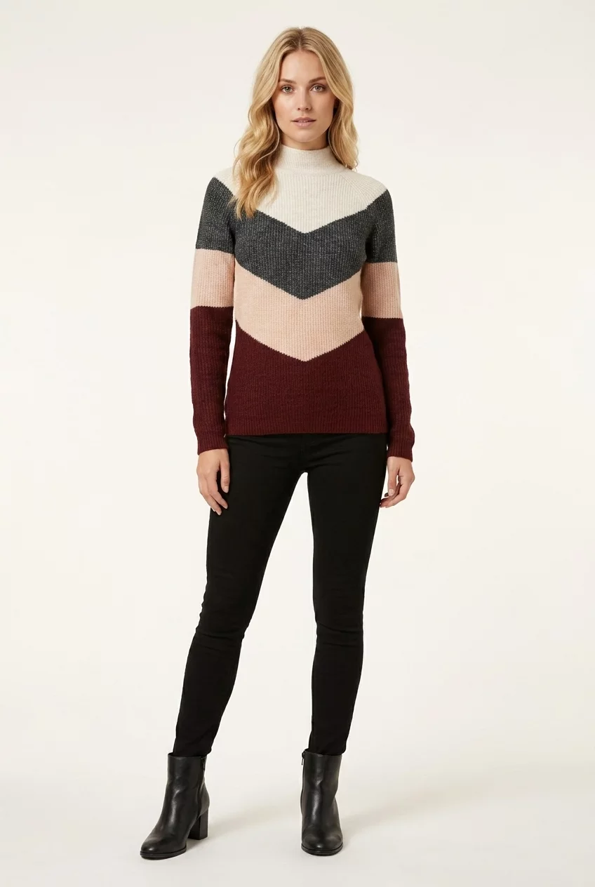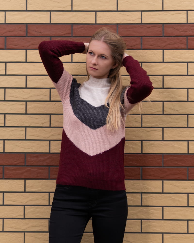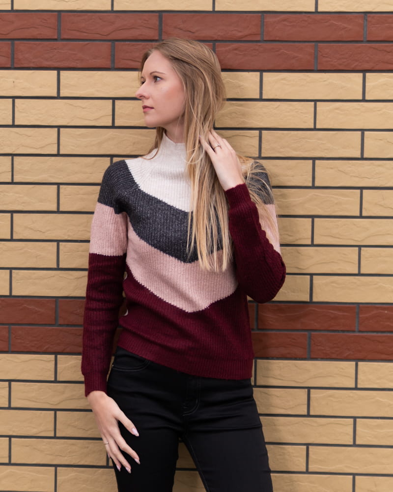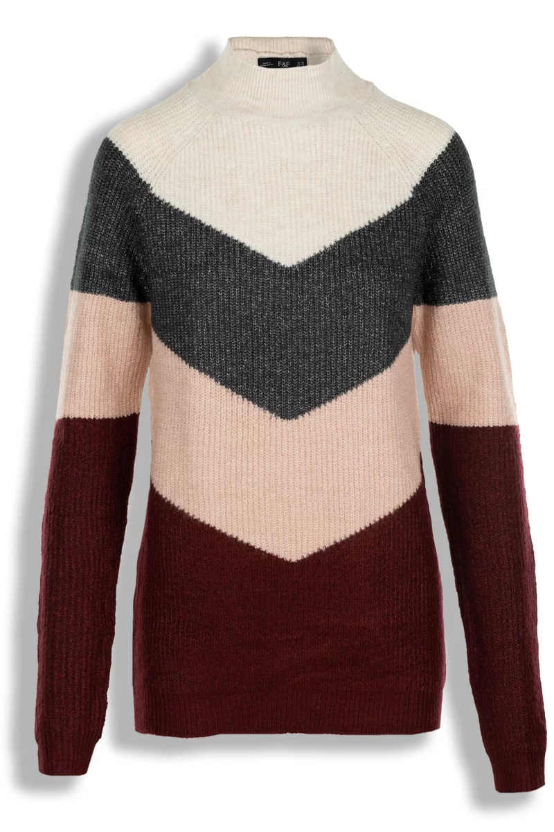 Półgolf firmy F&F. Wielokolorowy (dominują kolory: beż, grafit, brudny róż i burgundowy). Na długi rękaw, zakończony ściągaczem. Dekolt - półgolf. Dół swetra zakończony ściągaczem. Materiał miły w dotyku.