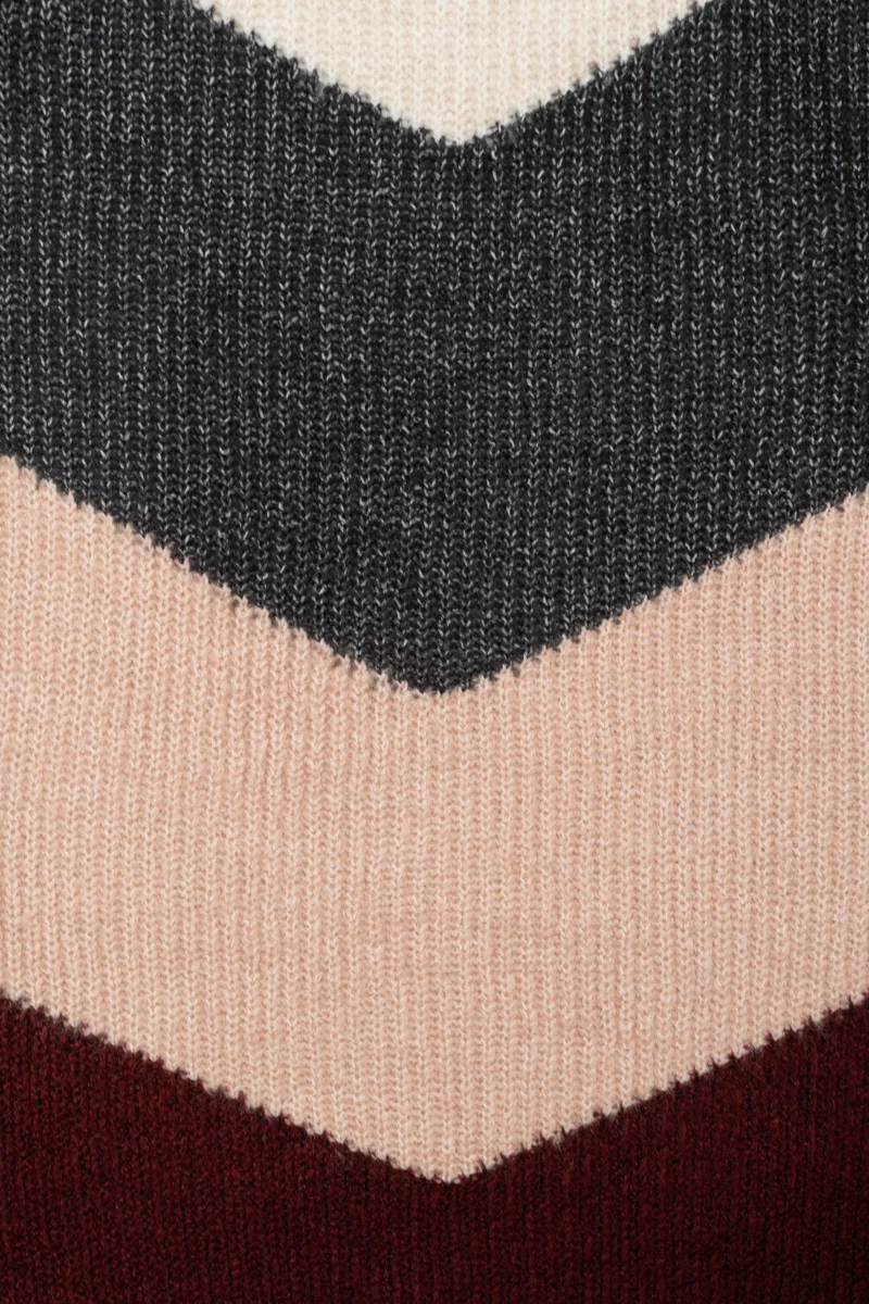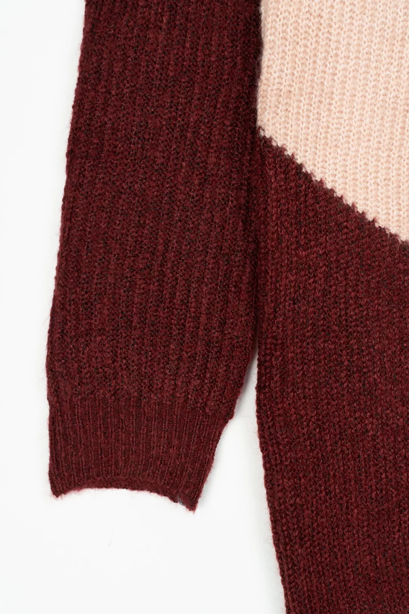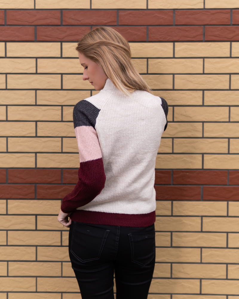 Półgolf firmy F&F. Wielokolorowy (dominują kolory: beż, grafit, brudny róż i burgundowy). Na długi rękaw, zakończony ściągaczem. Dekolt - półgolf. Dół swetra zakończony ściągaczem. Materiał miły w dotyku.
