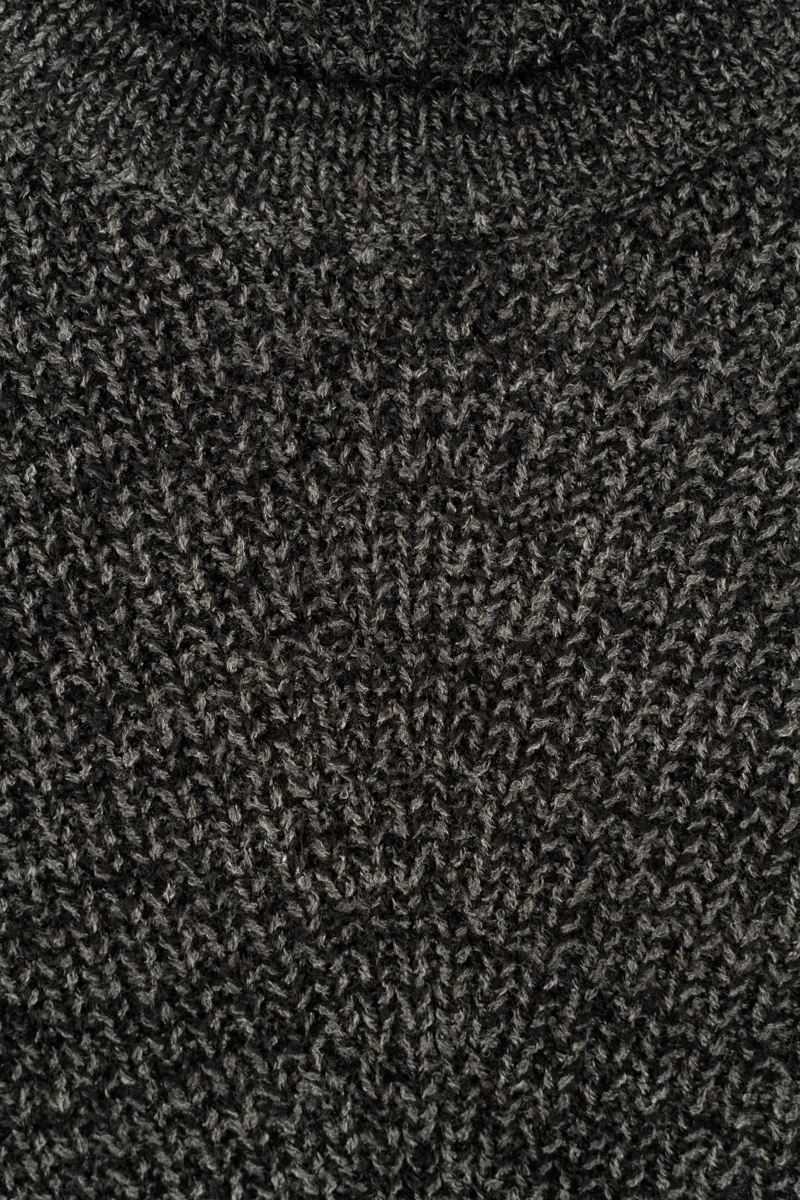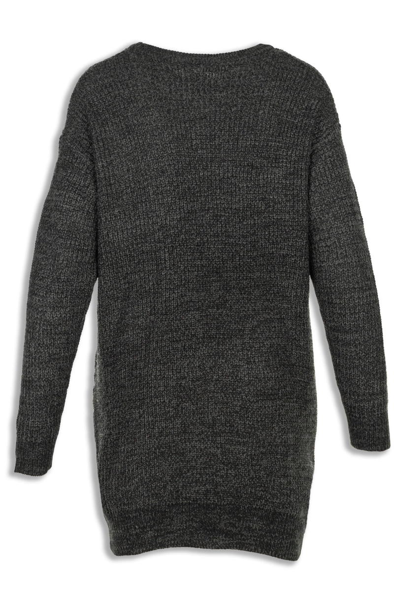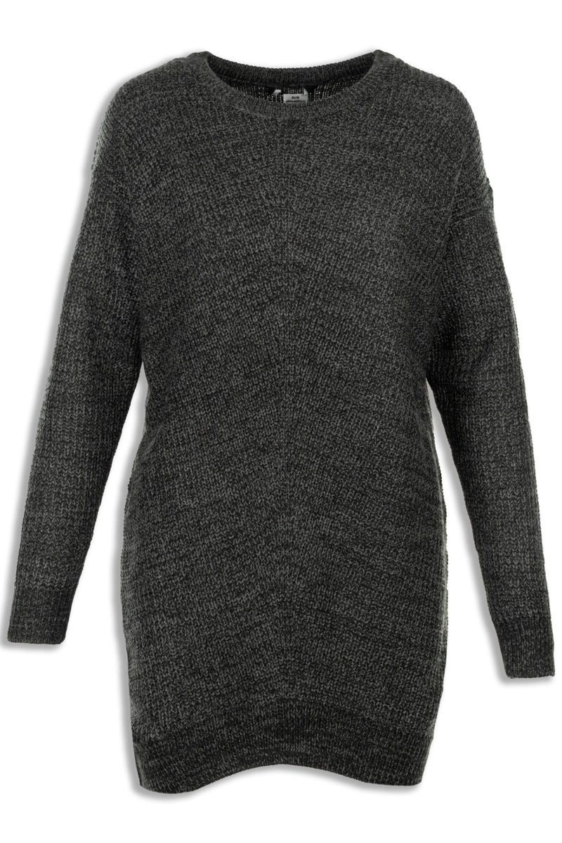 Dzianinowy sweter firmy Yours w odcieniu grafitowym (melanż). Dekolt okrągły. Na długi rękaw. Asymetryczny - o lekko dłuższym tyle. Dół swetra zakończony ściągaczem. Model oversize (luźny pod pachami).
