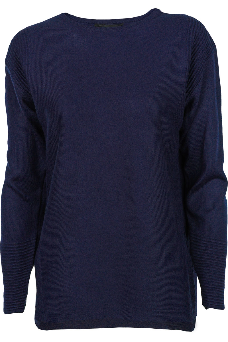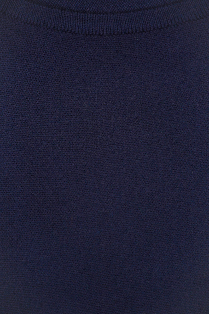 Sweter firmy Yours w odcieniu granatowym. Dekolt okrągły. Na długi rękaw, zakończony prążkowanym materiałem. Asymetryczny - o lekko dłuższym tyle. Sweter po bokach posiada wstawki z prążkowanego materiału. Dół swetra zakończony ściągaczem.