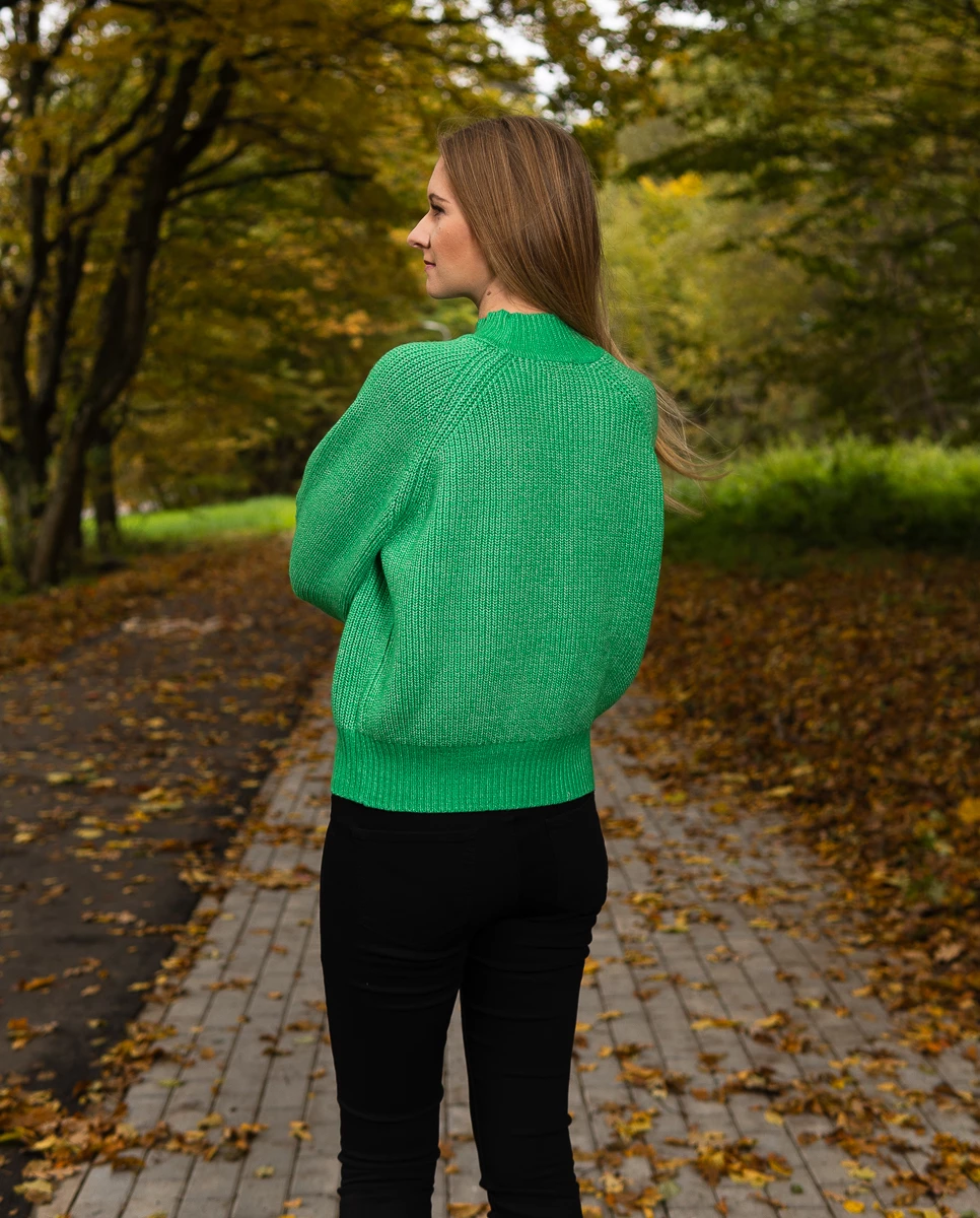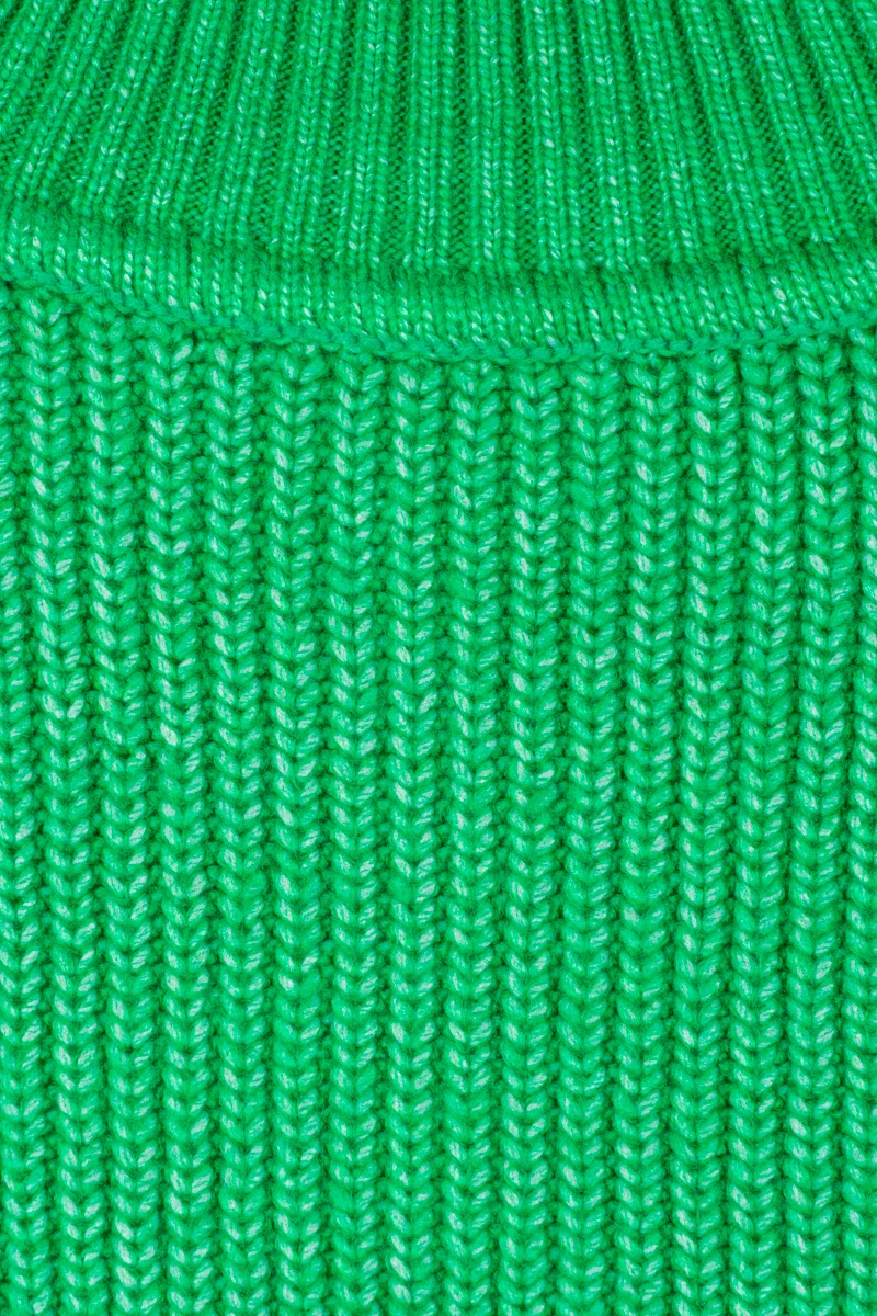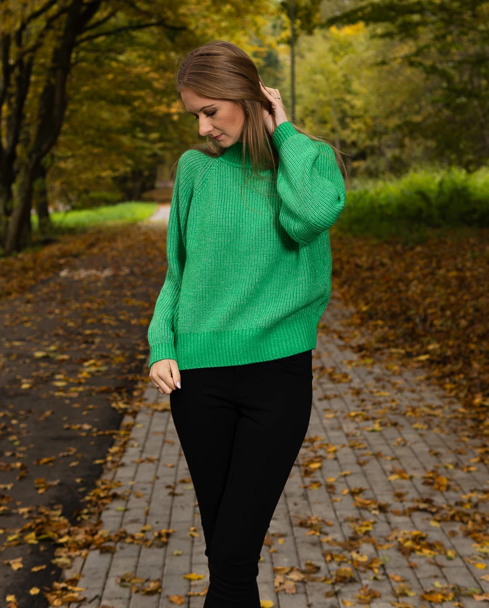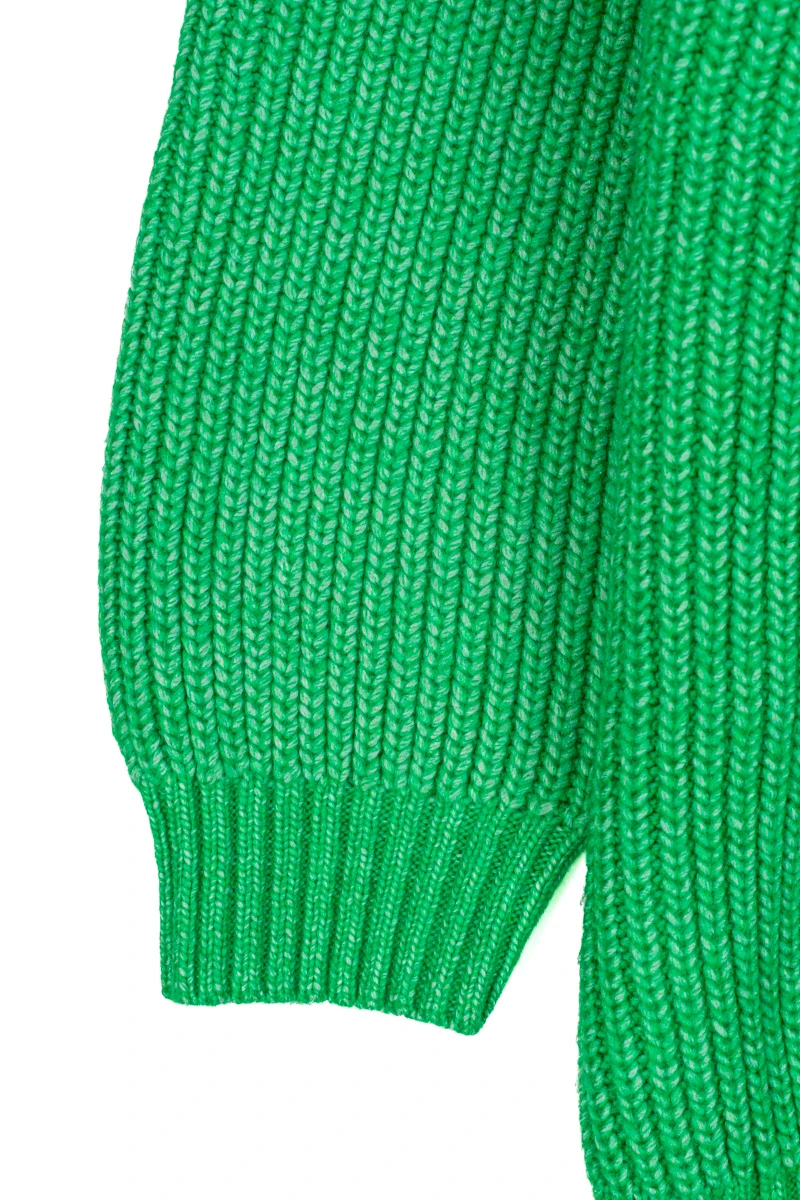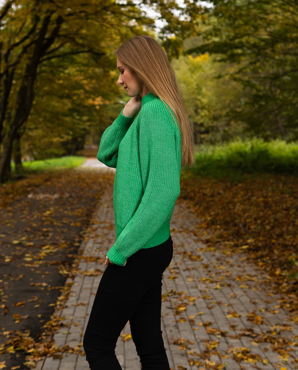Dzianinowy półgolf firmy F&F w odcieniu soczystej zieleni. Długie, szerokie rękawy, zakończone ściągaczem. Dekolt - półgolf. Dół swetra zakończony ściągaczem.